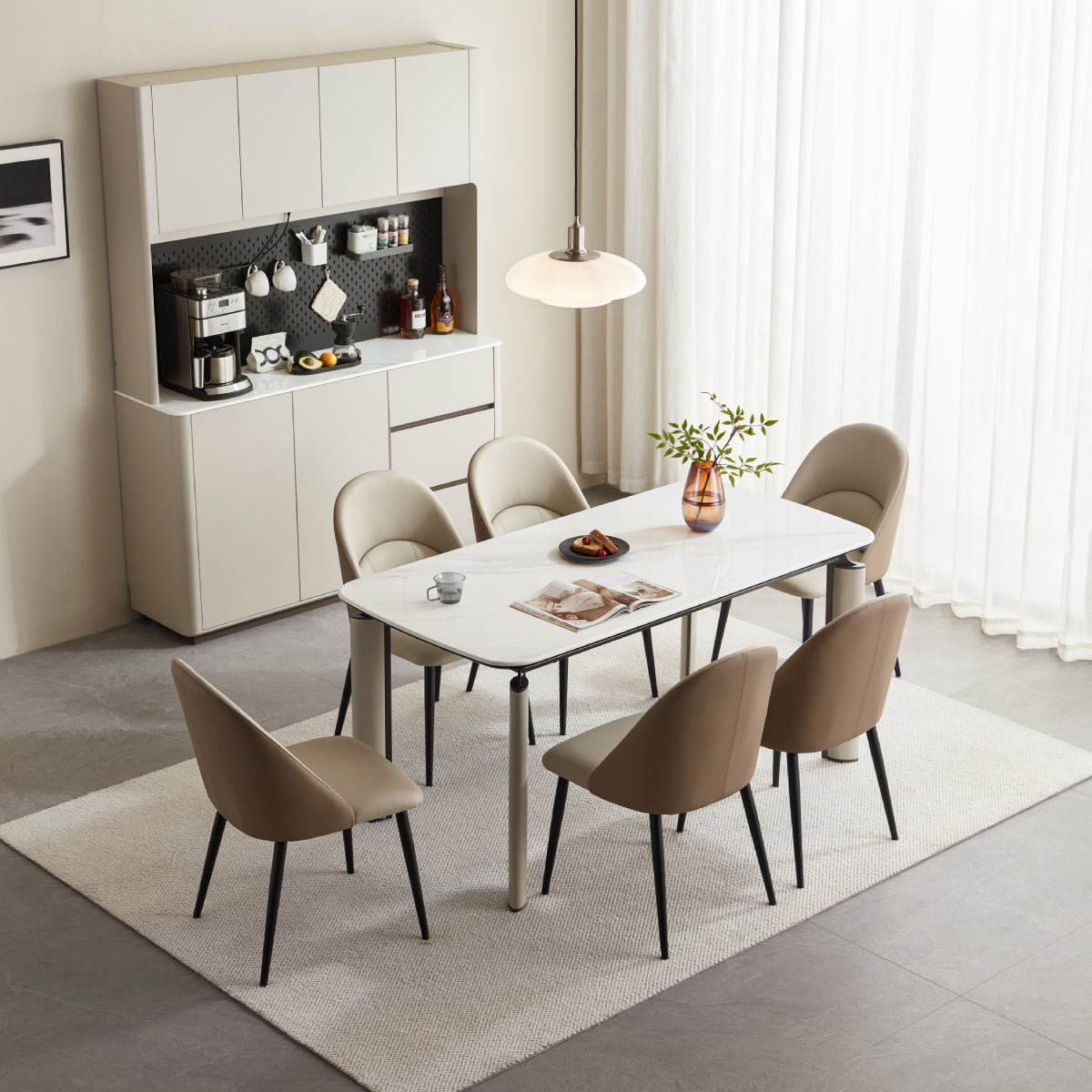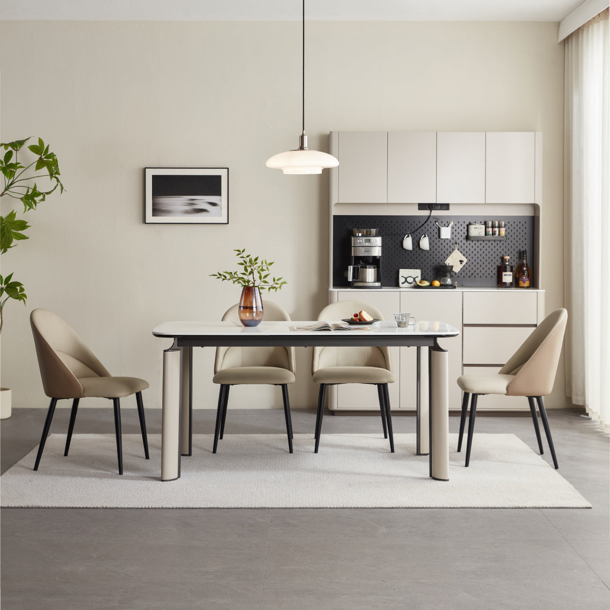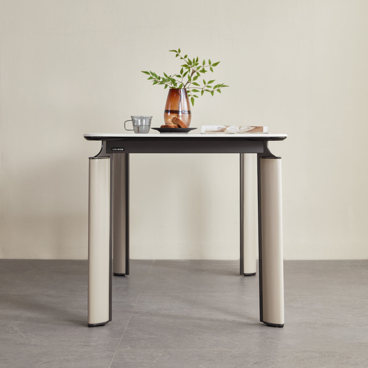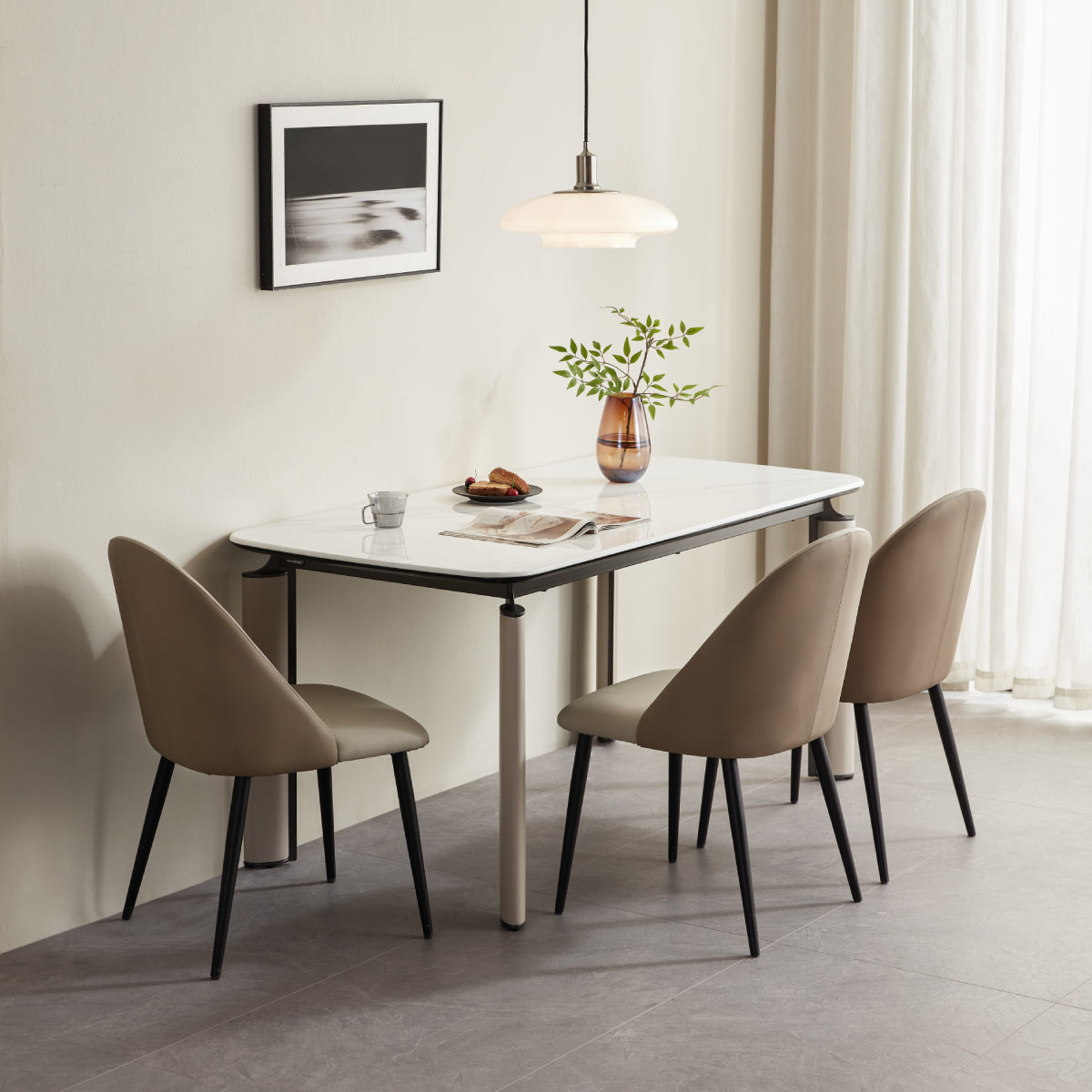 Minimalist modern dining table with a clean silhouette and gloss sintered stone top that resists heat, stains, and scratches, showcasing unique natural marbling for a refined contemporary look; easy-to-clean, low-maintenance surface.