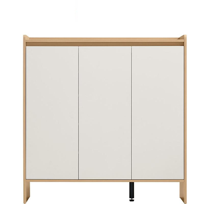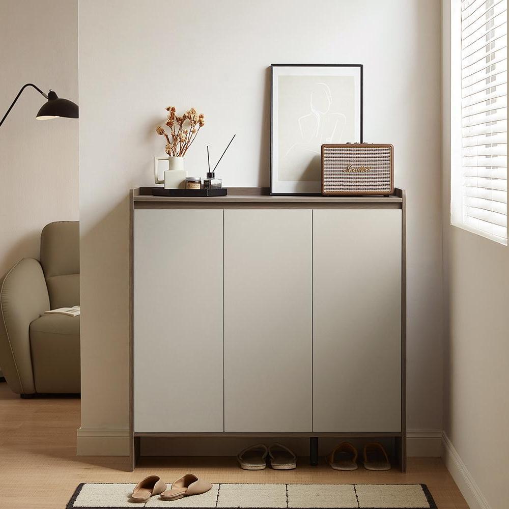 The structure of this minimalist shoe cabinet features a warm, natural oak frame beautifully contrasted with three matte, light gray cabinet fronts. Clean lines and a slightly lifted profile define its contemporary Scandinavian aesthetic.