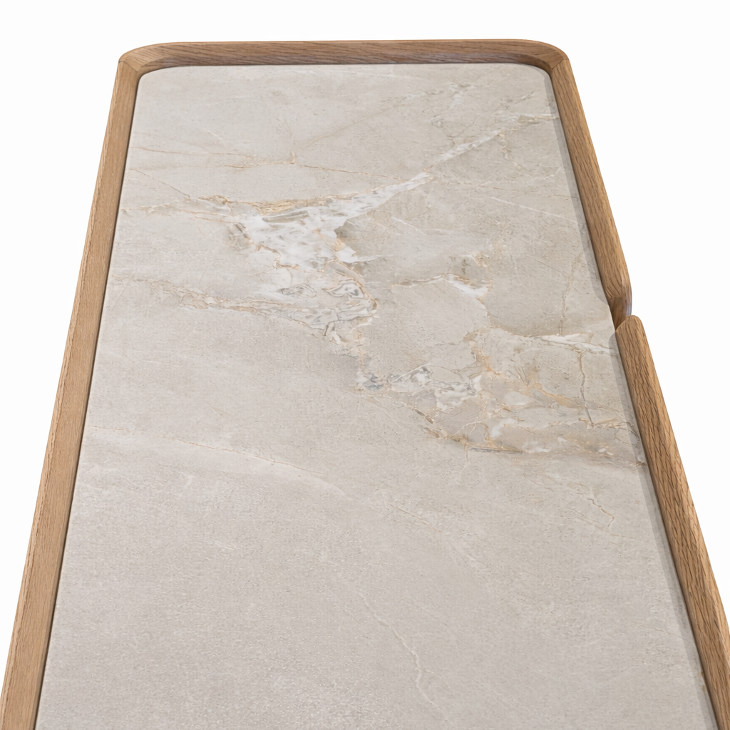 Crowned with a durable ceramic top, this contemporary beige sideboard features elegant marble-like veining contrasting beautifully with its natural wood finish. Sleek lines and softly rounded edges create a sophisticated, modern aesthetic for any living or dining space.