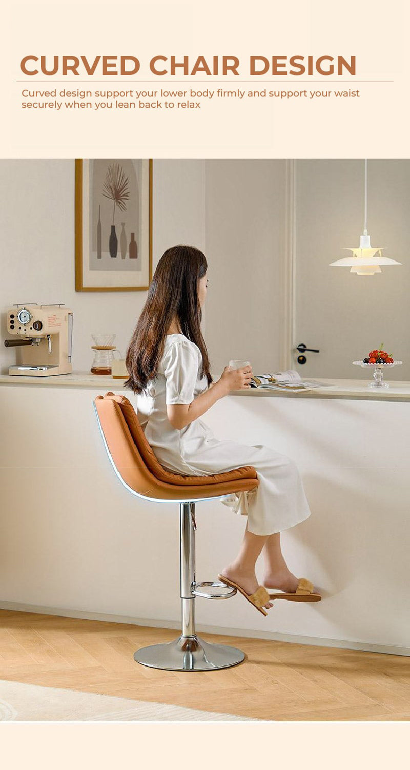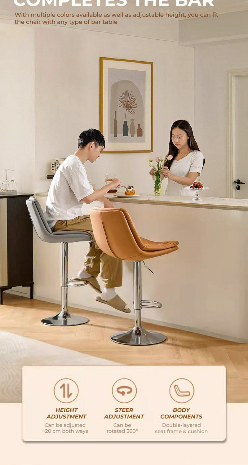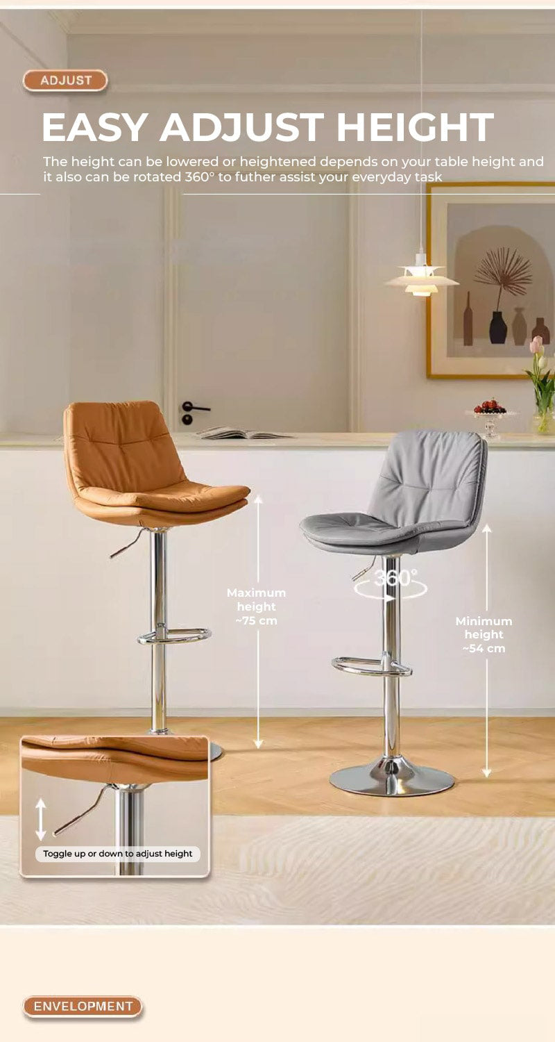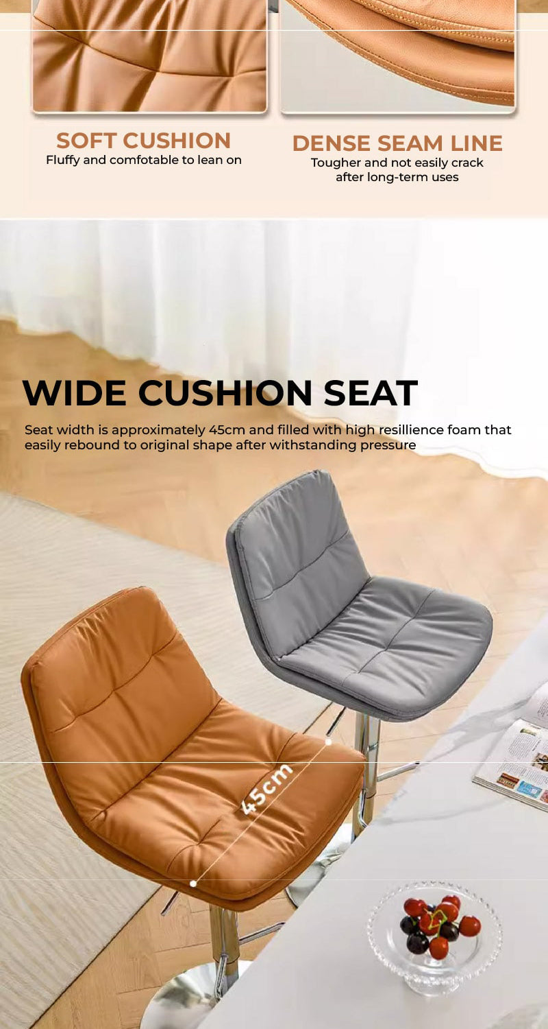 This sleek bar stool is the epitome of modern comfort with its extra-wide, soft seat designed for extended seating. The adjustable height feature ensures it fits a range of spaces, from kitchen counters to bar tables. The polished chrome finish gives it a sharp, contemporary look that pairs beautifully with the plush, cushioned seat.