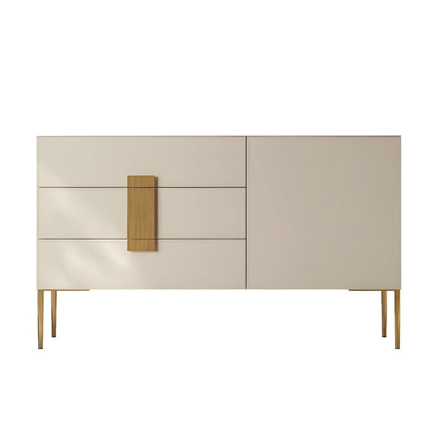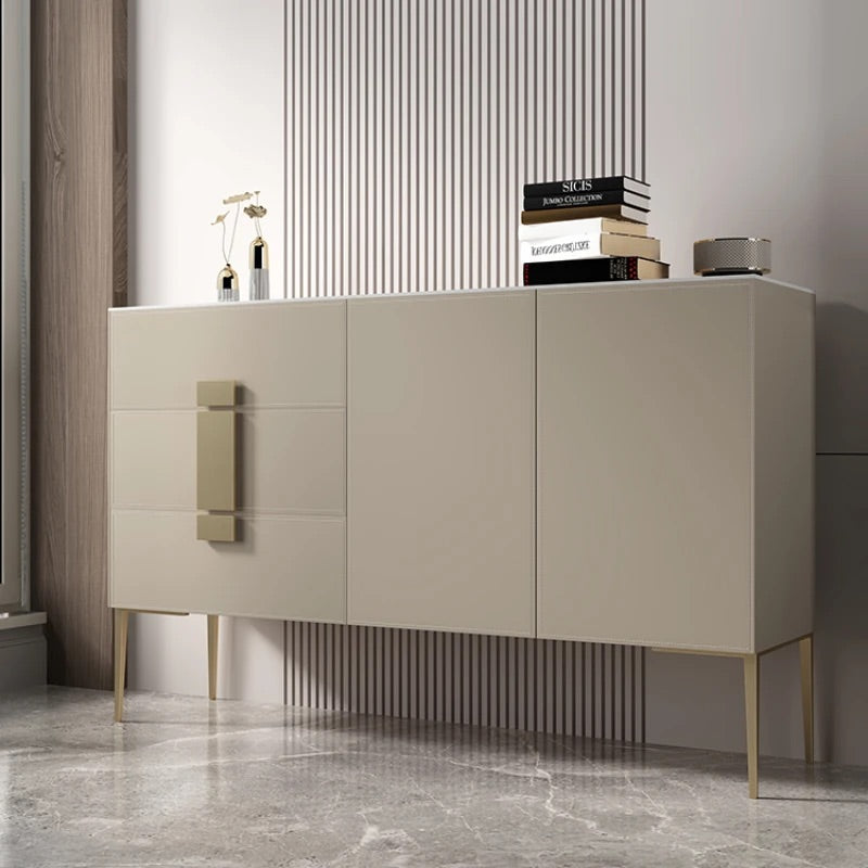 Elevate your living space with this modern beige sideboard, designed to blend functionality with elegance. Its sleek plywood construction is wrapped in a smooth leather finish, enhanced by subtle gold accents and slender metal legs for a touch of luxury. The ample storage includes cabinets and drawers, perfect for organizing essentials while keeping your space clutter-free.