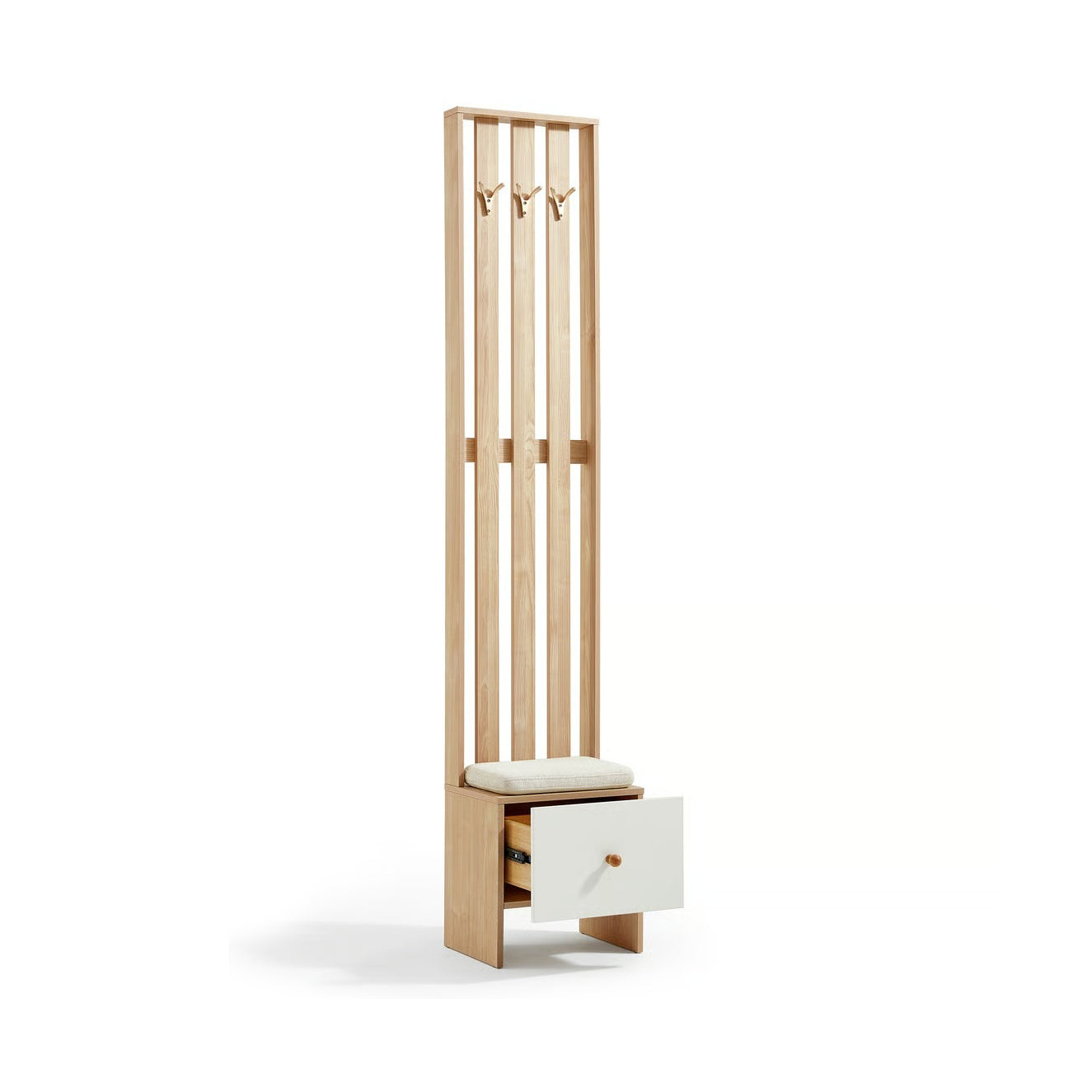 Boasting a modern minimalist aesthetic, this hall tree blends warm natural wood with a clean white drawer front, perfect for contemporary entryways. It features a three-peg coat rack for hanging essentials and a comfortable cushioned shoe bench for practical seating.