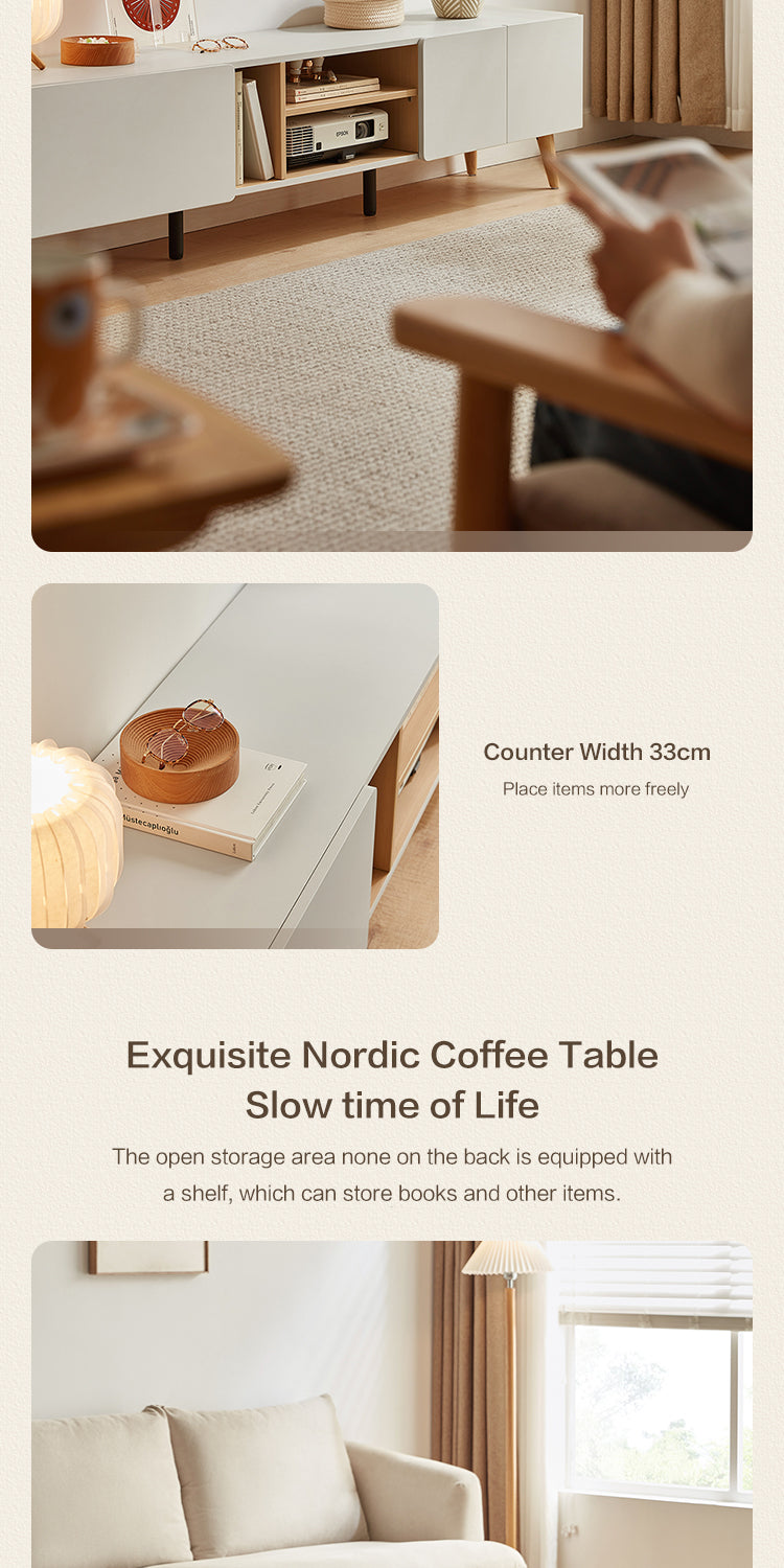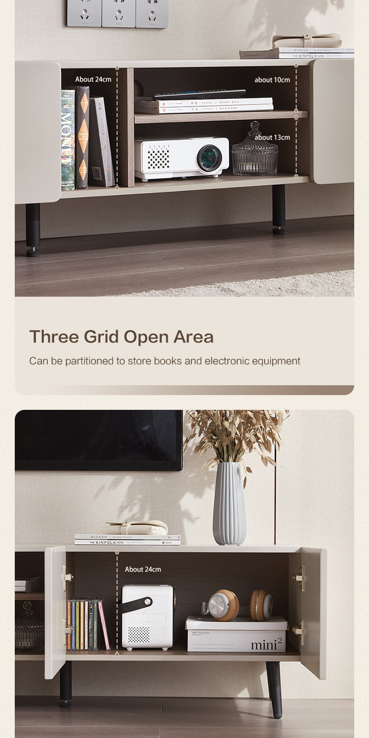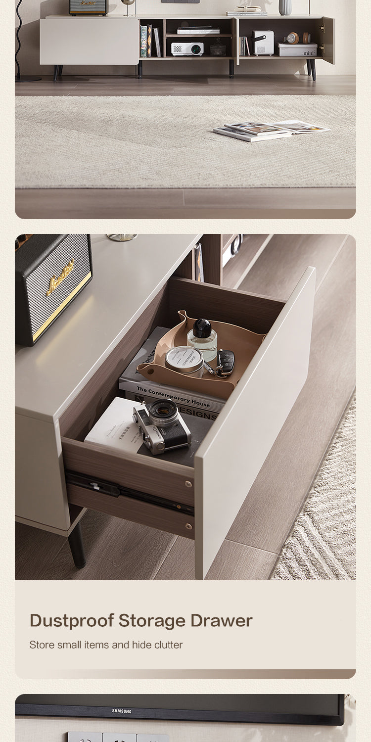 Contemporary TV unit integrates seamless functionality with clean, architectural lines. The off-white facade, accented by natural wood interiors and elevated legs, brings a bright, open feel to any entertainment space. Its thoughtful design includes a cable management hole to keep wires neatly tucked away.
