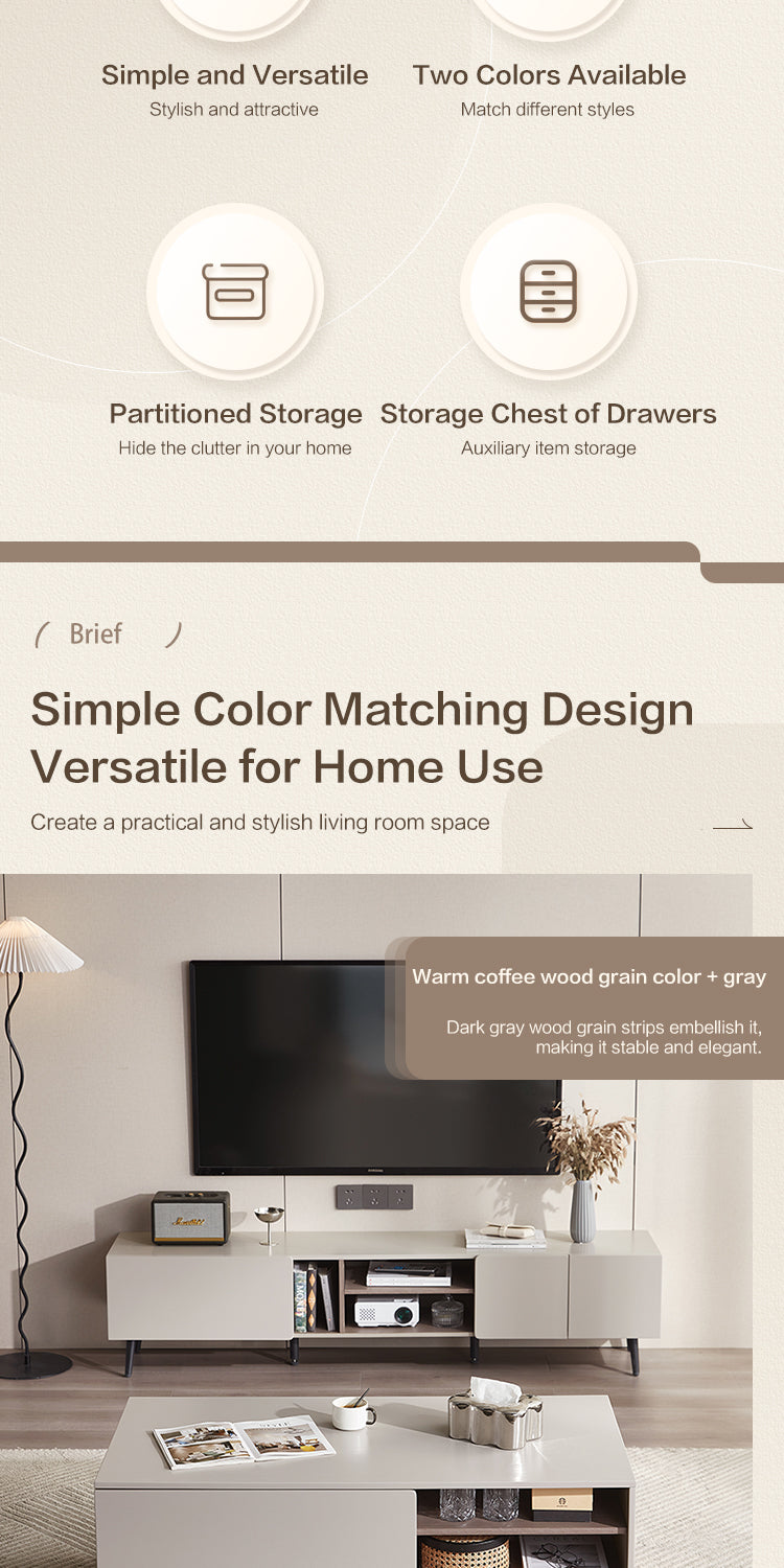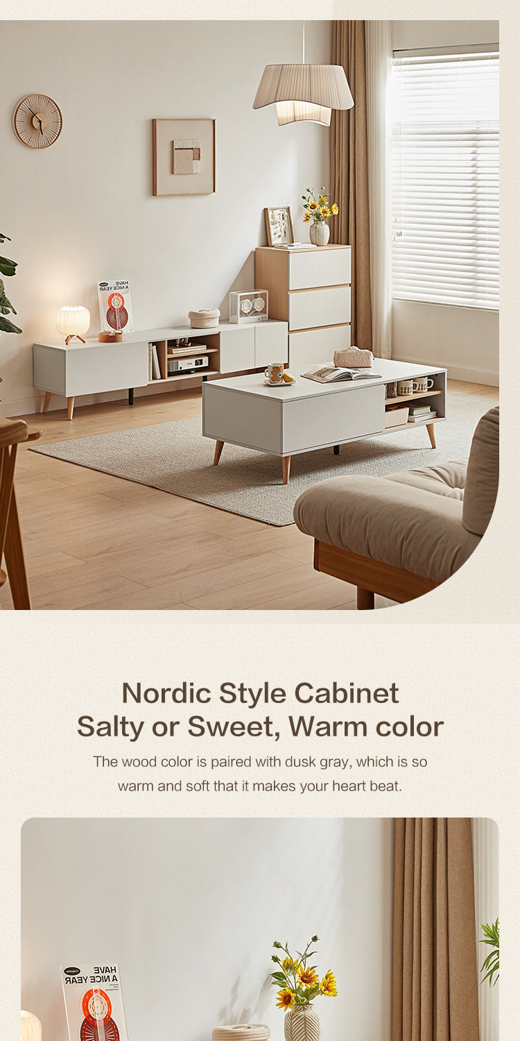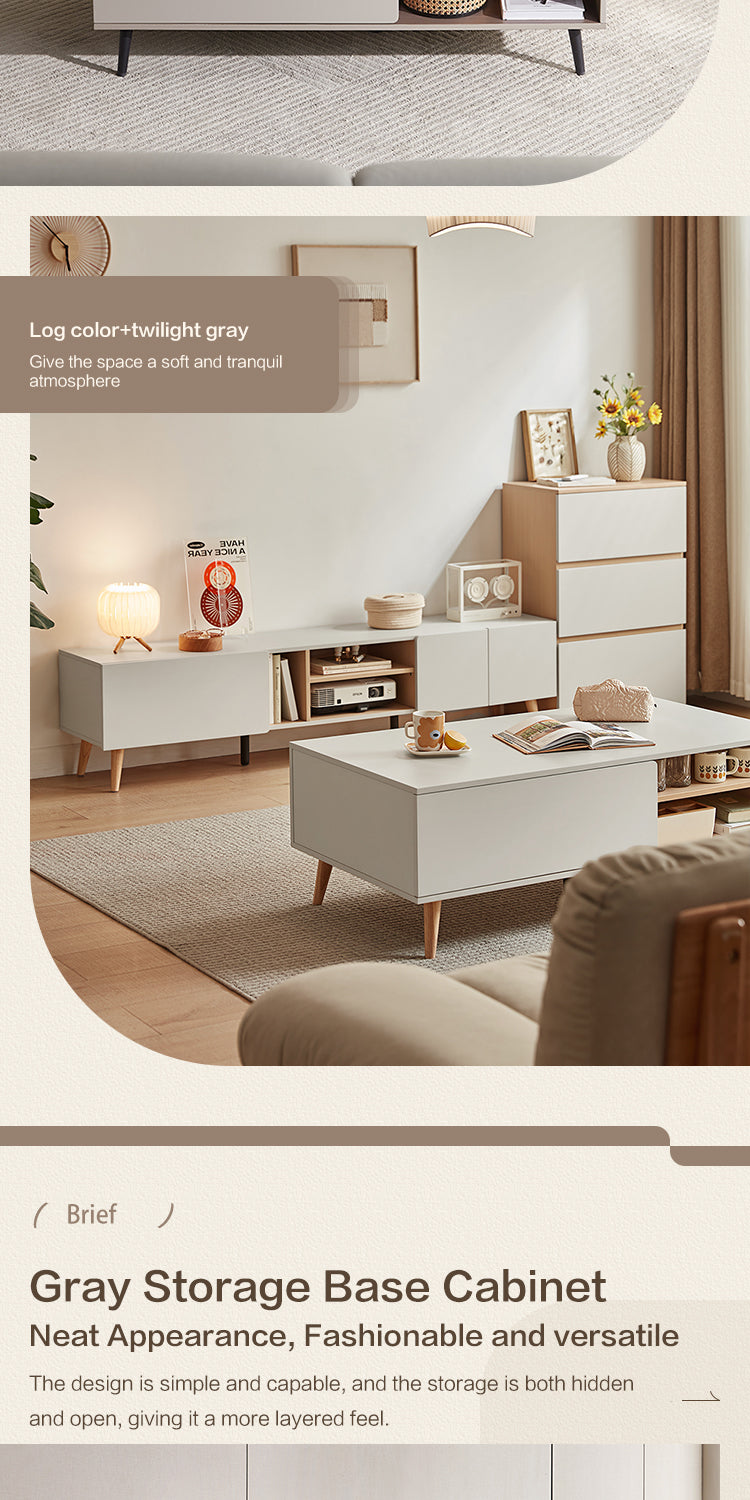 Contemporary TV unit integrates seamless functionality with clean, architectural lines. The off-white facade, accented by natural wood interiors and elevated legs, brings a bright, open feel to any entertainment space. Its thoughtful design includes a cable management hole to keep wires neatly tucked away.