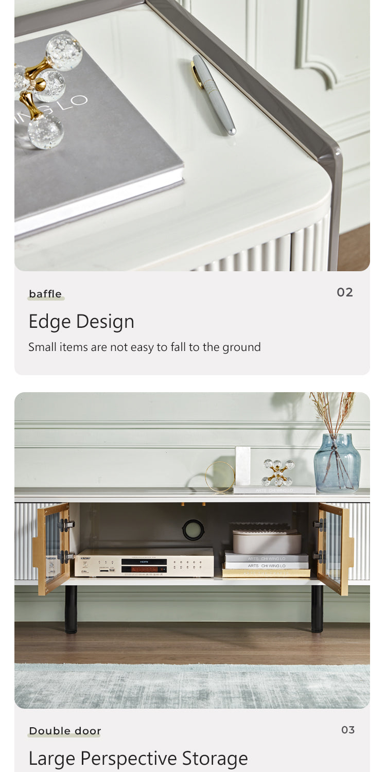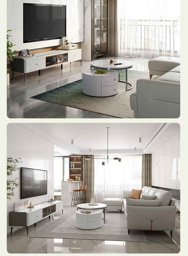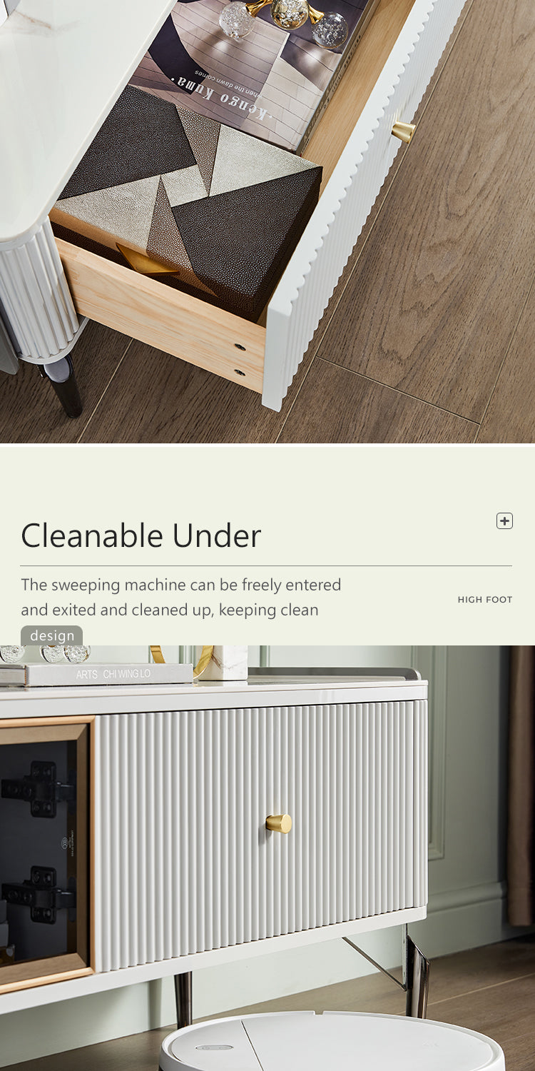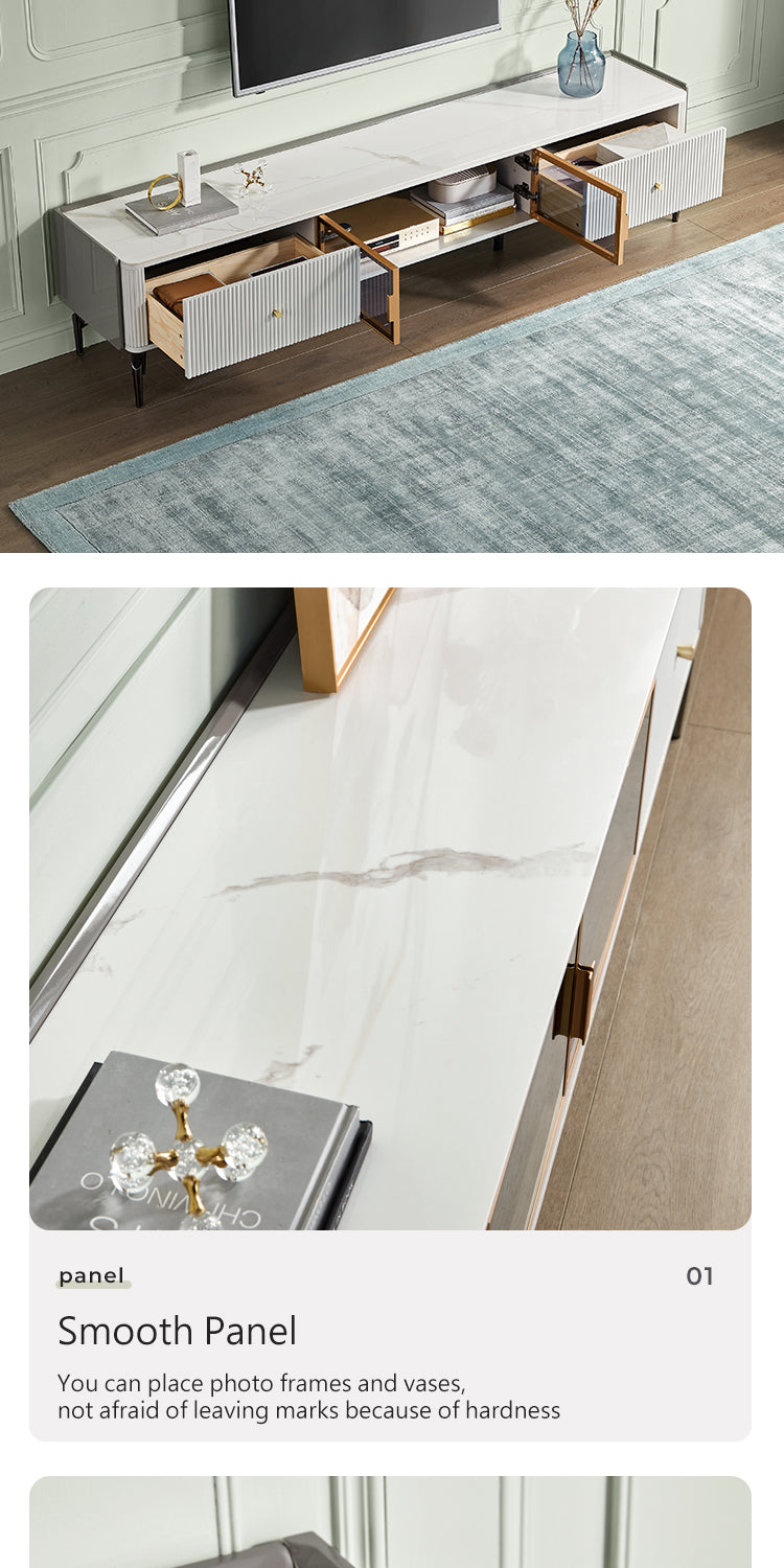 Exemplifying modern sophistication, this low-profile entertainment unit boasts a glossy sintered stone tabletop that harmonizes with a melamine board structure. The natural mineral processing of the tabletop yields a chemical, heat, and scratch-resistant surface, elevating the unit's resilience and elegance.