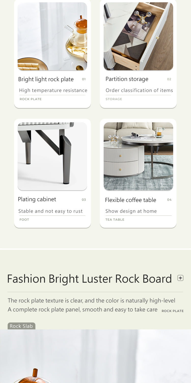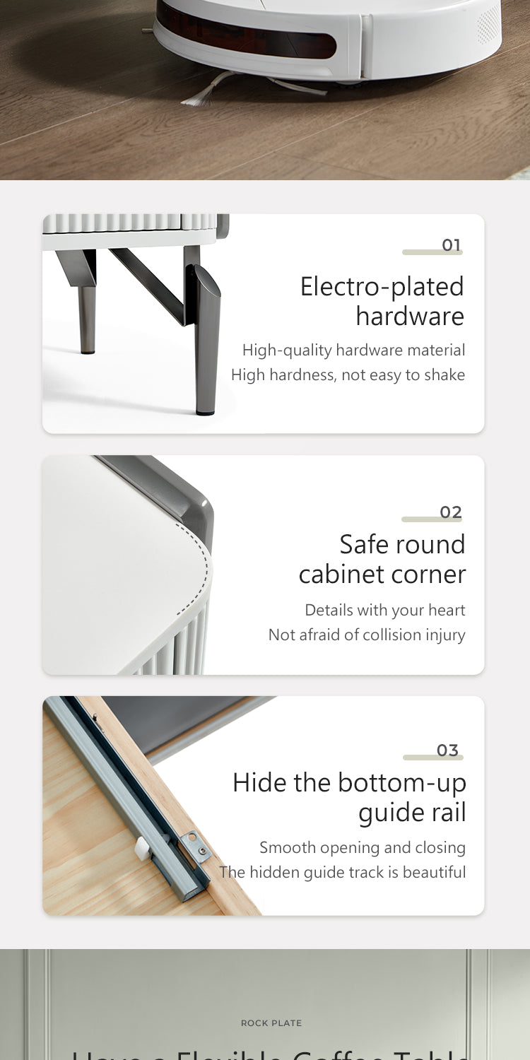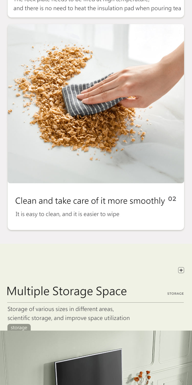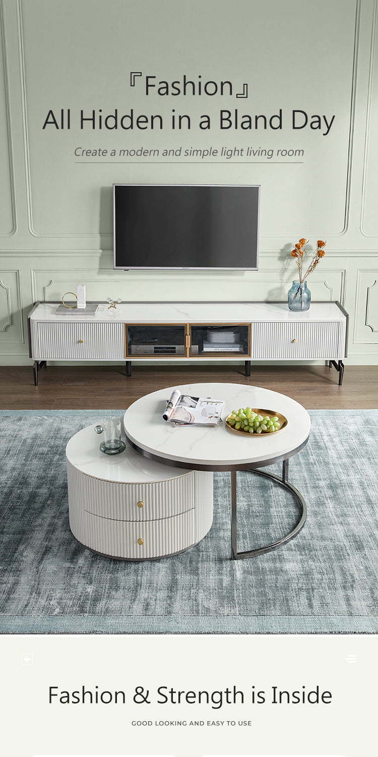 Exemplifying modern sophistication, this low-profile entertainment unit boasts a glossy sintered stone tabletop that harmonizes with a melamine board structure. The natural mineral processing of the tabletop yields a chemical, heat, and scratch-resistant surface, elevating the unit's resilience and elegance.