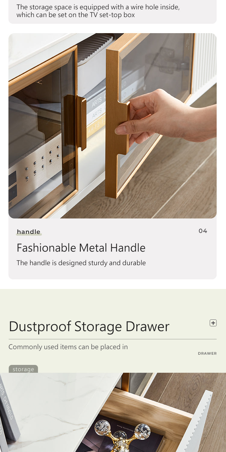 Functionality is at the heart of its design, featuring two smooth-gliding drawers for hidden storage and a central compartment with a cable opening for seamless media setup. A tempered glass panel not only adds to its sleek appearance but also allows infrared signals to pass through, ensuring remote controls remain effective.