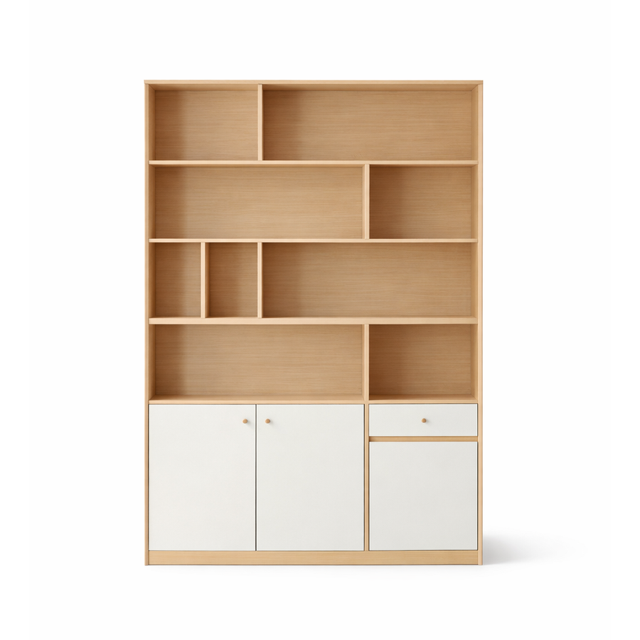 Features an innovative design with varied open shelving, perfect for showcasing your favorite books and decor. The natural wood tone complements any contemporary or Scandinavian interior, offering a warm yet minimalist aesthetic for your living room or home office.