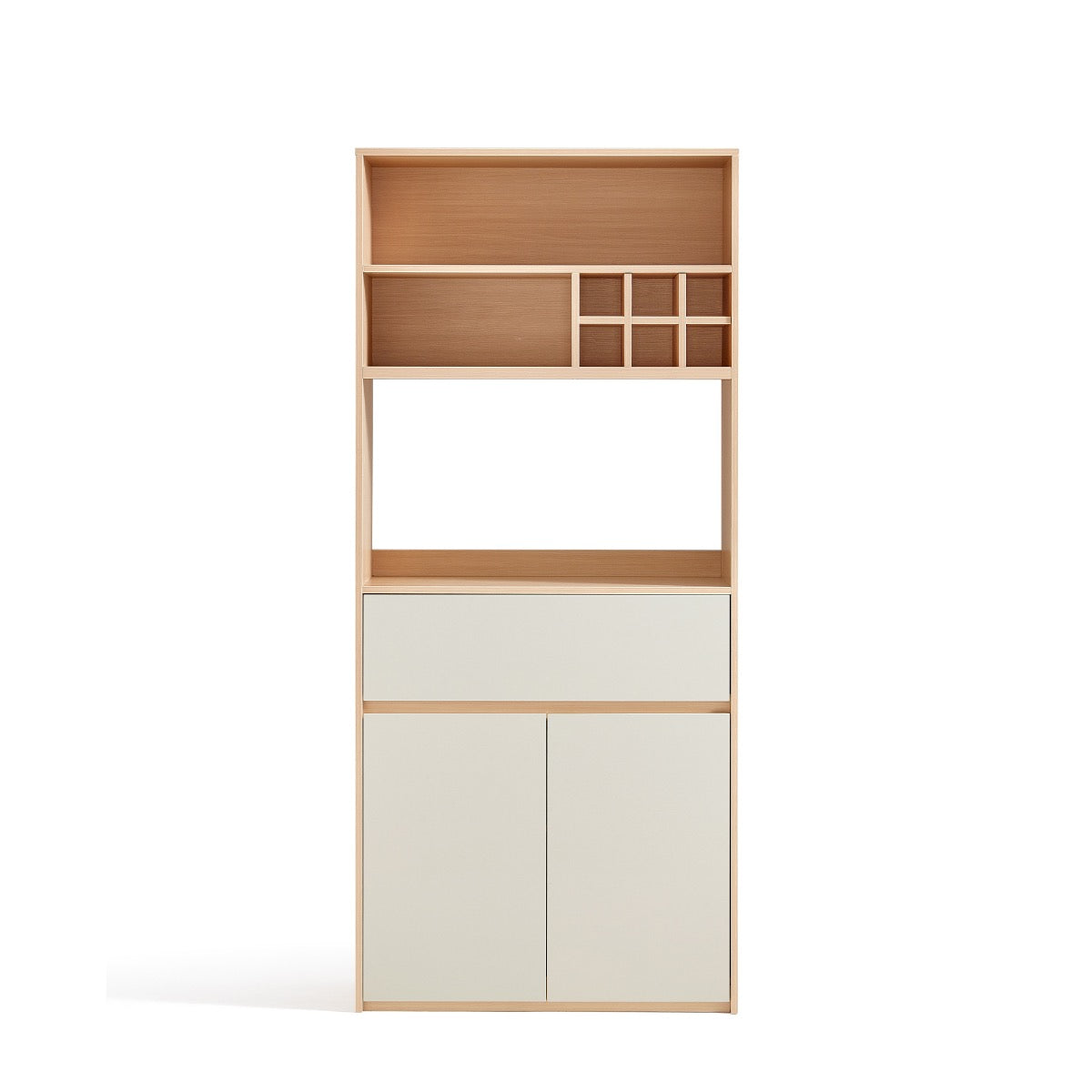 Enclosed storage keeps items dust-free while open shelves and a removable wine rack offer versatile display and bottle organization; smooth melamine finish delivers a durable, low-gloss surface with clean, modern lines and a slim profile.