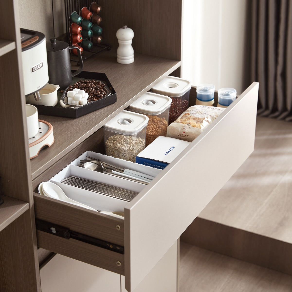 Enclosed Storage: Protects belongings from dust while providing discreet organization for everyday items and fragile ware. Removable Wine Rack: Customizable bottle storage that can be removed to expand shelf space for larger items. Ergonomic J-Pull Handle: Comfortable grip design ensures smooth drawer operation and contributes to a sleek contemporary aesthetic. Durable Melamine Finish: Scratch-resistant, low-maintenance surface resists moisture and cleans easily while maintaining a refined look.
