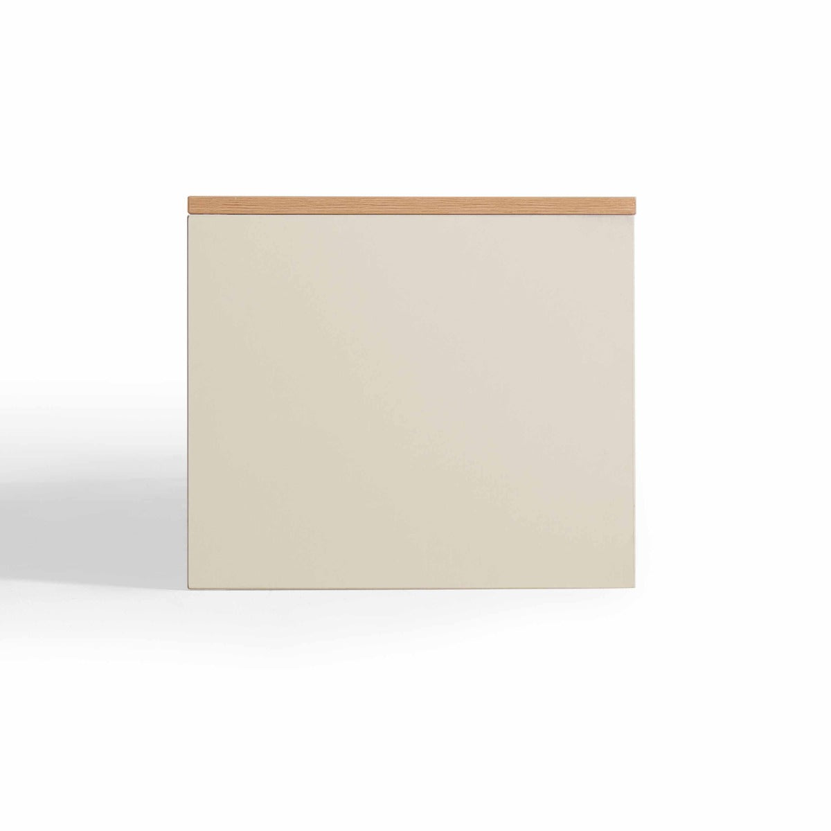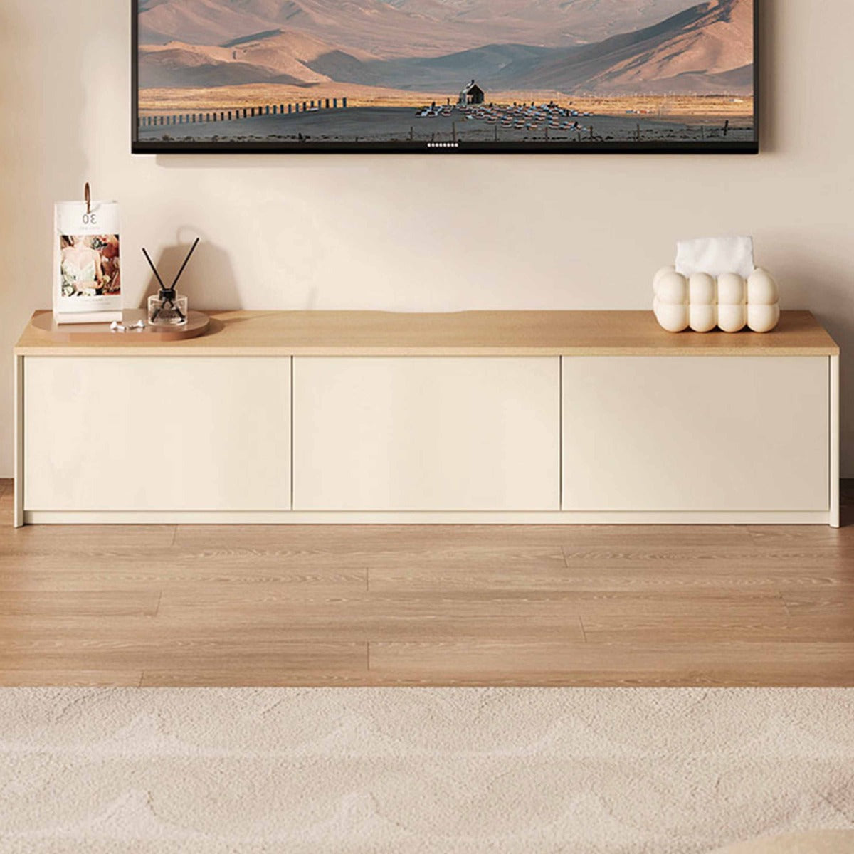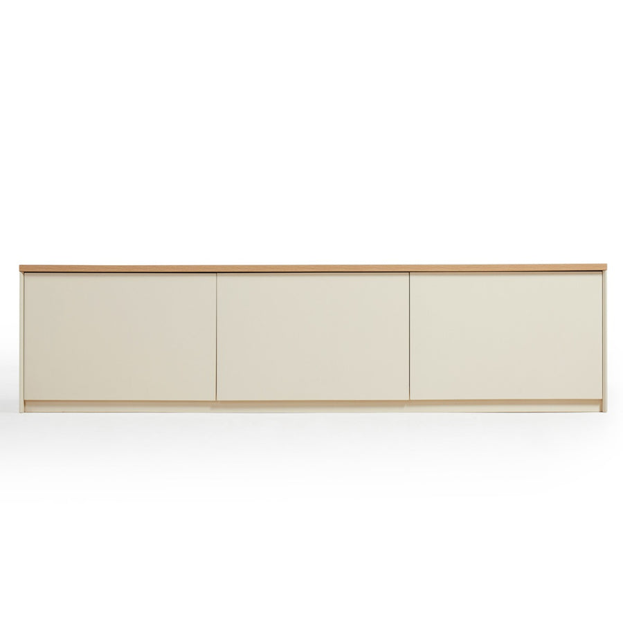 Natural wood grain veneer crowns this ultra-minimalist media console, offering a refreshing contrast to the matte, creamy white body. The elongated, low-slung silhouette maintains clean sightlines, defining modern, serene living spaces.