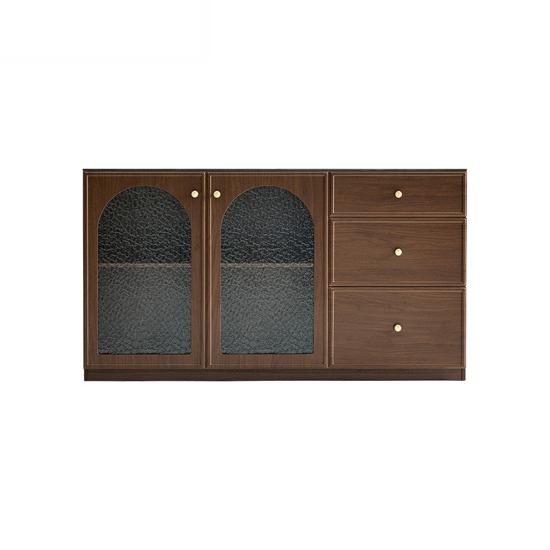 Smart mixed storage combines three deep drawers for cutlery and small items with a ventilated cabinet behind textured tempered glass for safe display and mold-preventing airflow, ideal as a modern buffet, sideboard or coffee station.