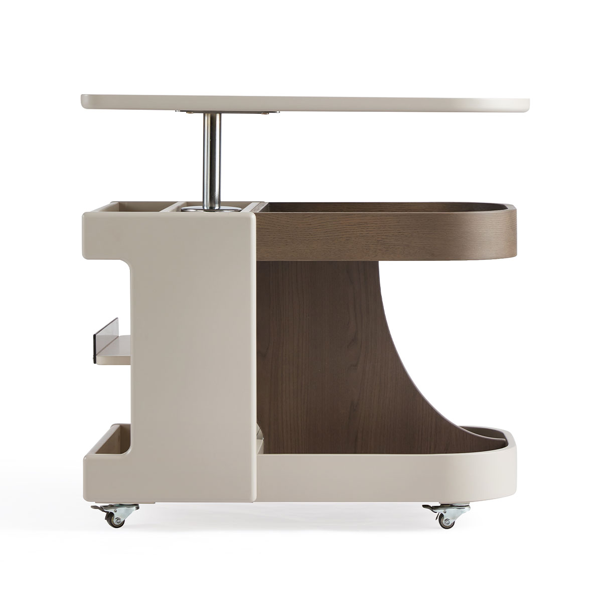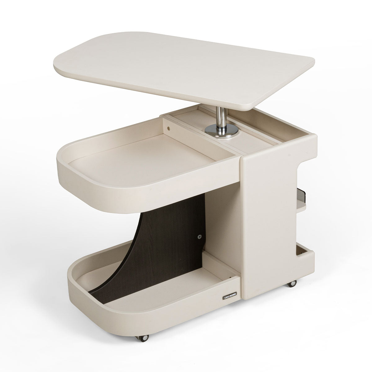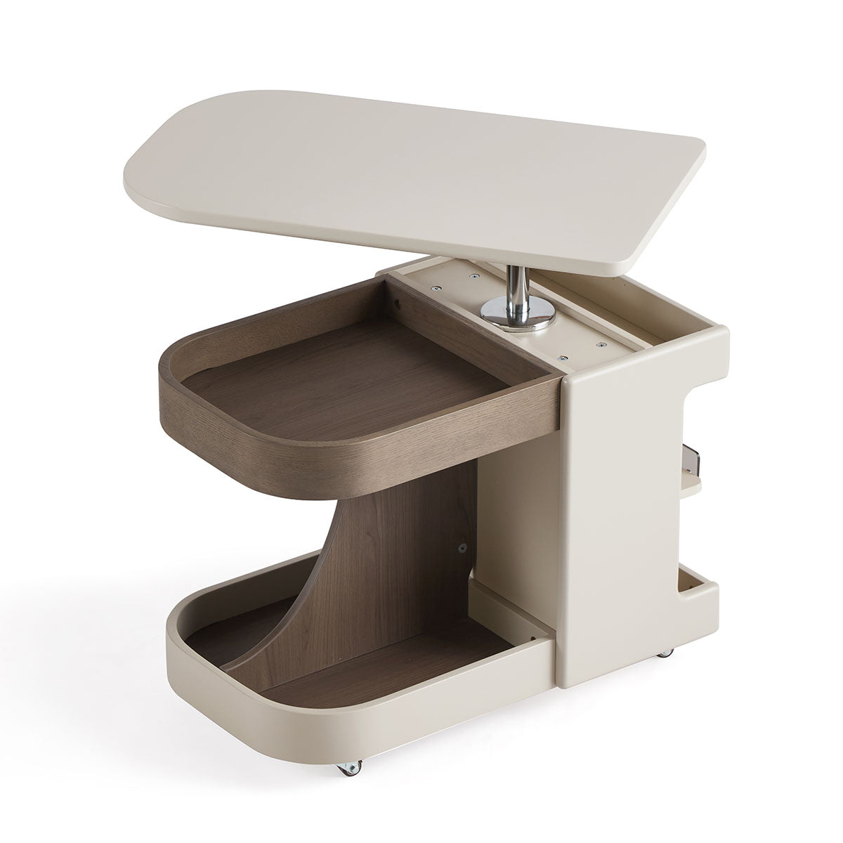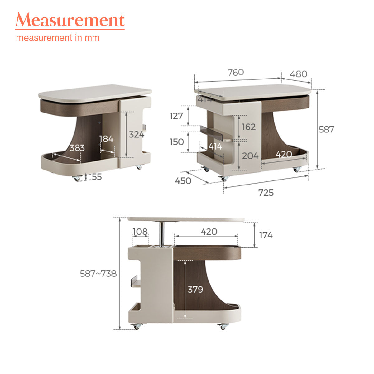 Smooth hydraulic lift, safety-locked casters, and a swivel panel enable ergonomic lounging or focused work, while semi-hidden compartments, open shelves, and tiered side shelving deliver smart storage, effortless mobility, and versatile positioning for today’s multifunctional living spaces.