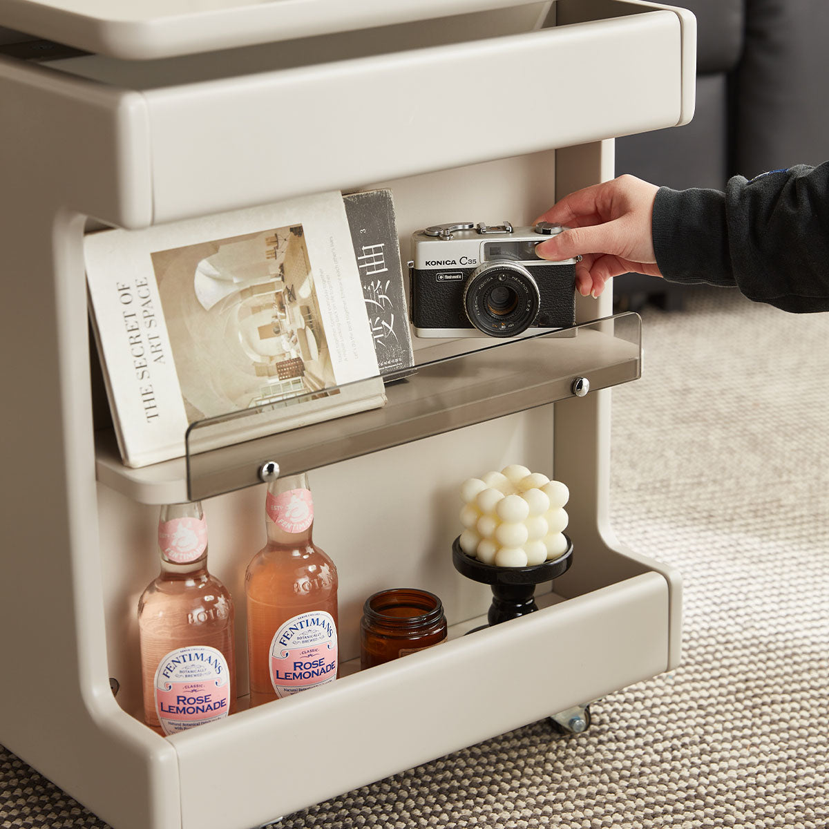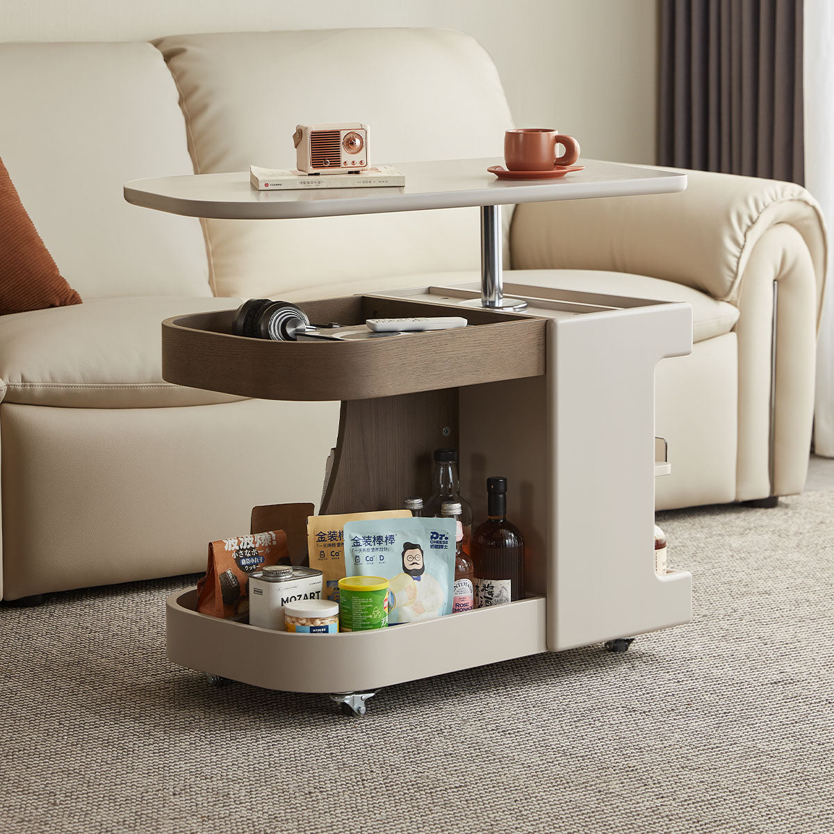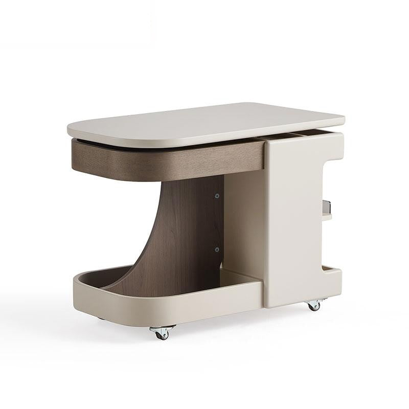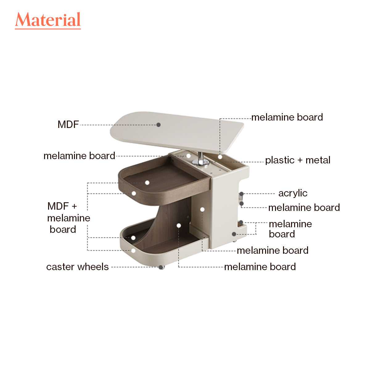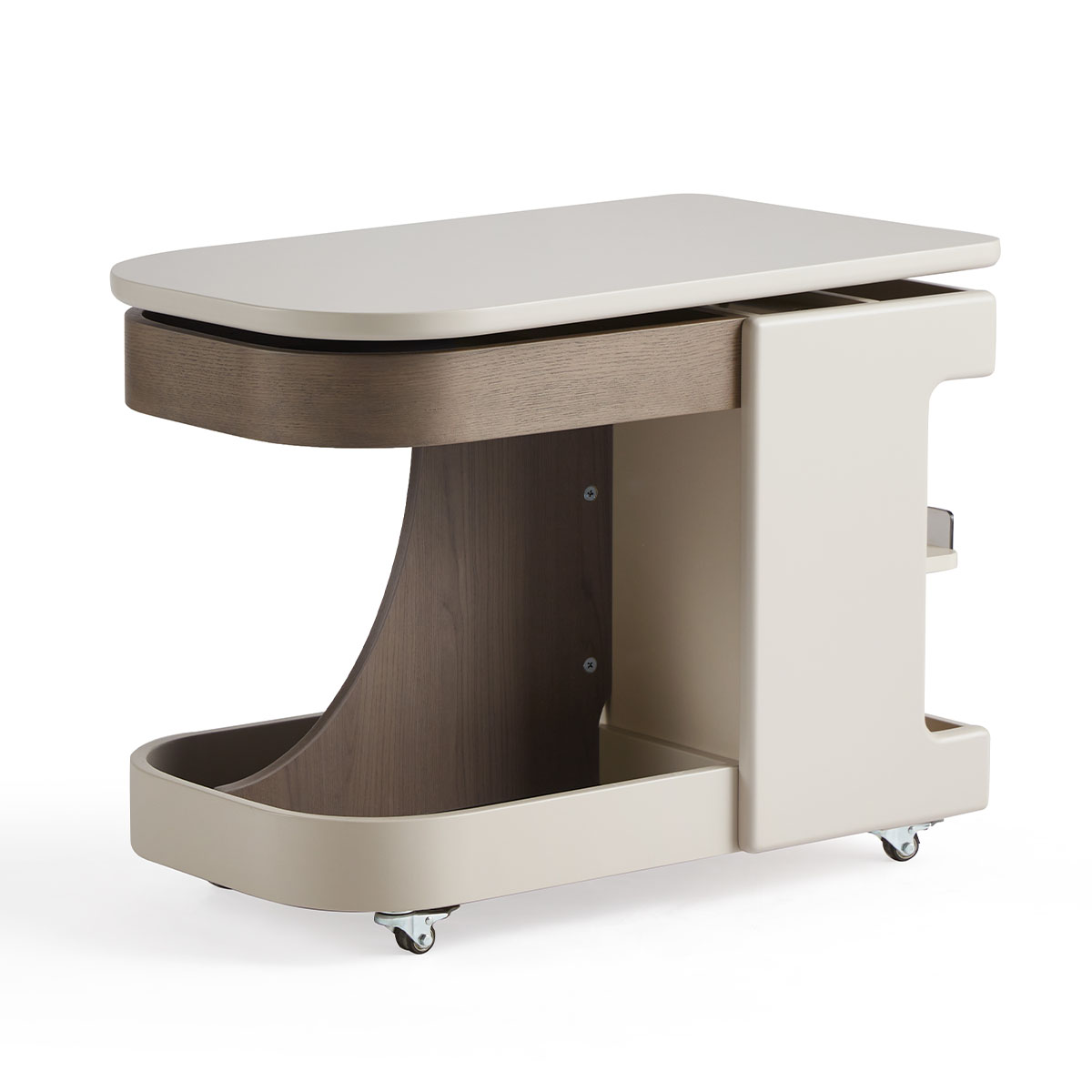 Smooth hydraulic lift, safety-locked casters, and a swivel panel enable ergonomic lounging or focused work, while semi-hidden compartments, open shelves, and tiered side shelving deliver smart storage, effortless mobility, and versatile positioning for today’s multifunctional living spaces.