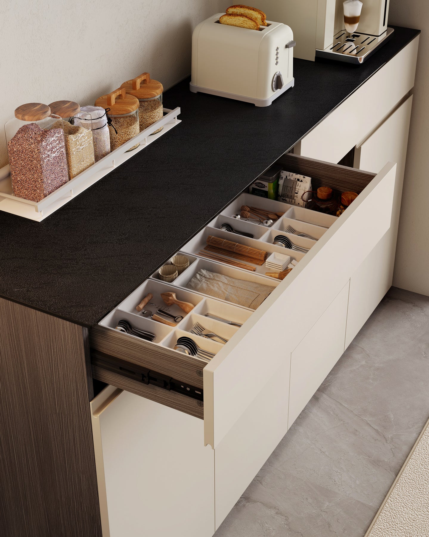 J-Pull Cabinet Doors:J-pull cabinet doors deliver seamless, handle-free operation that complements the modern minimalist silhouette.