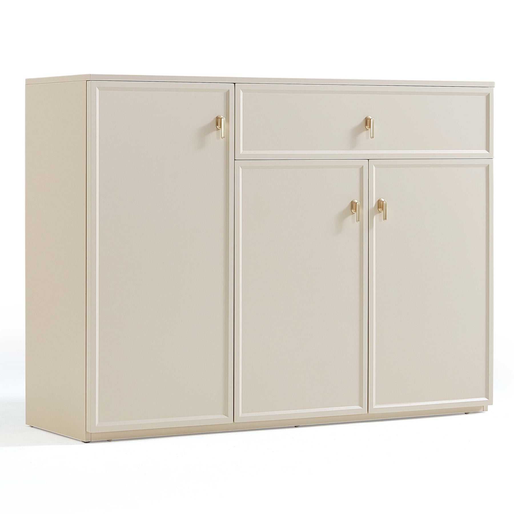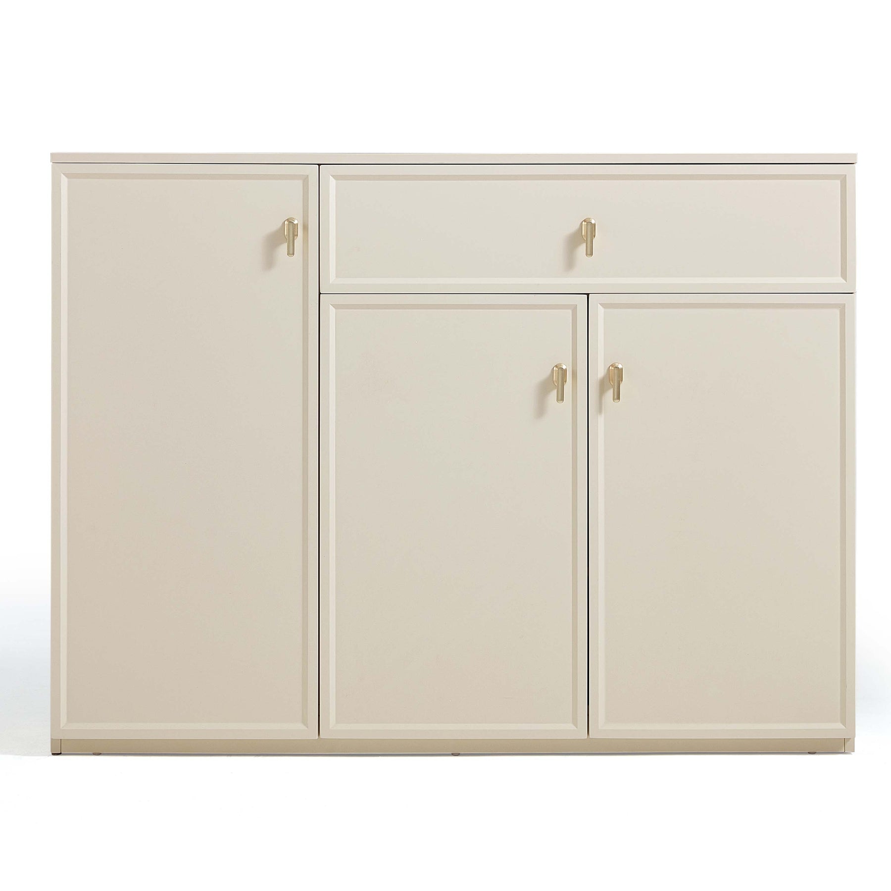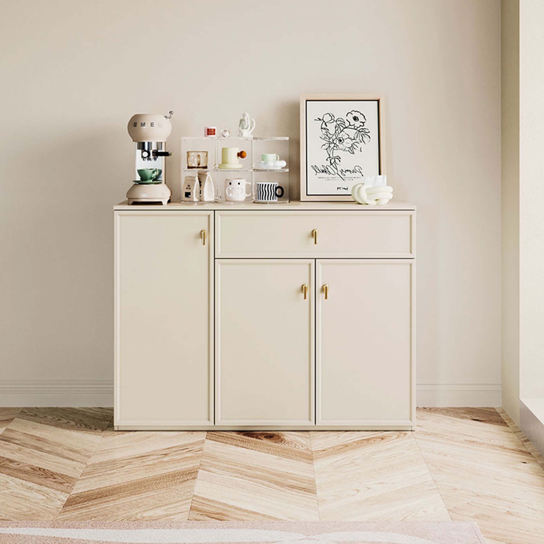 Cream melamine storage cabinet with warping-resistant board, featuring a smooth single drawer and two enclosed swing-door compartments for discreet, dust-free organization; subtle cream finish and clean lines suit contemporary, Scandinavian-inspired interiors.