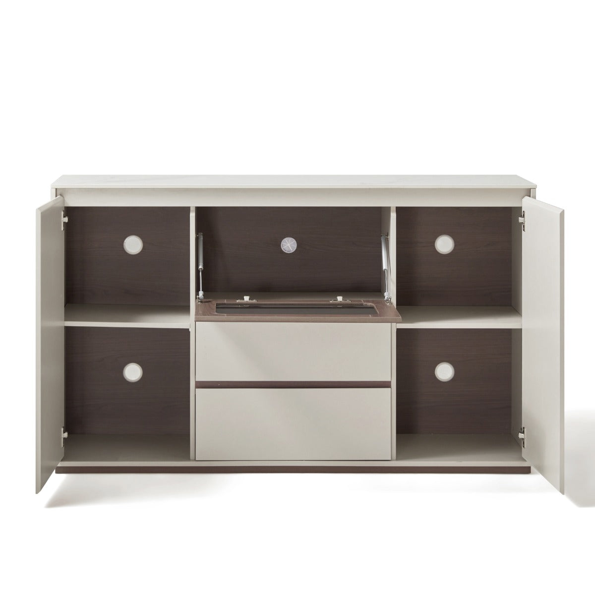 Versatile storage includes two pull-out drawers, dual side cabinets and a hydraulic flip-down tinted glass compartment; media-ready ventilation and cable grommet keep electronics cool and cables organized.