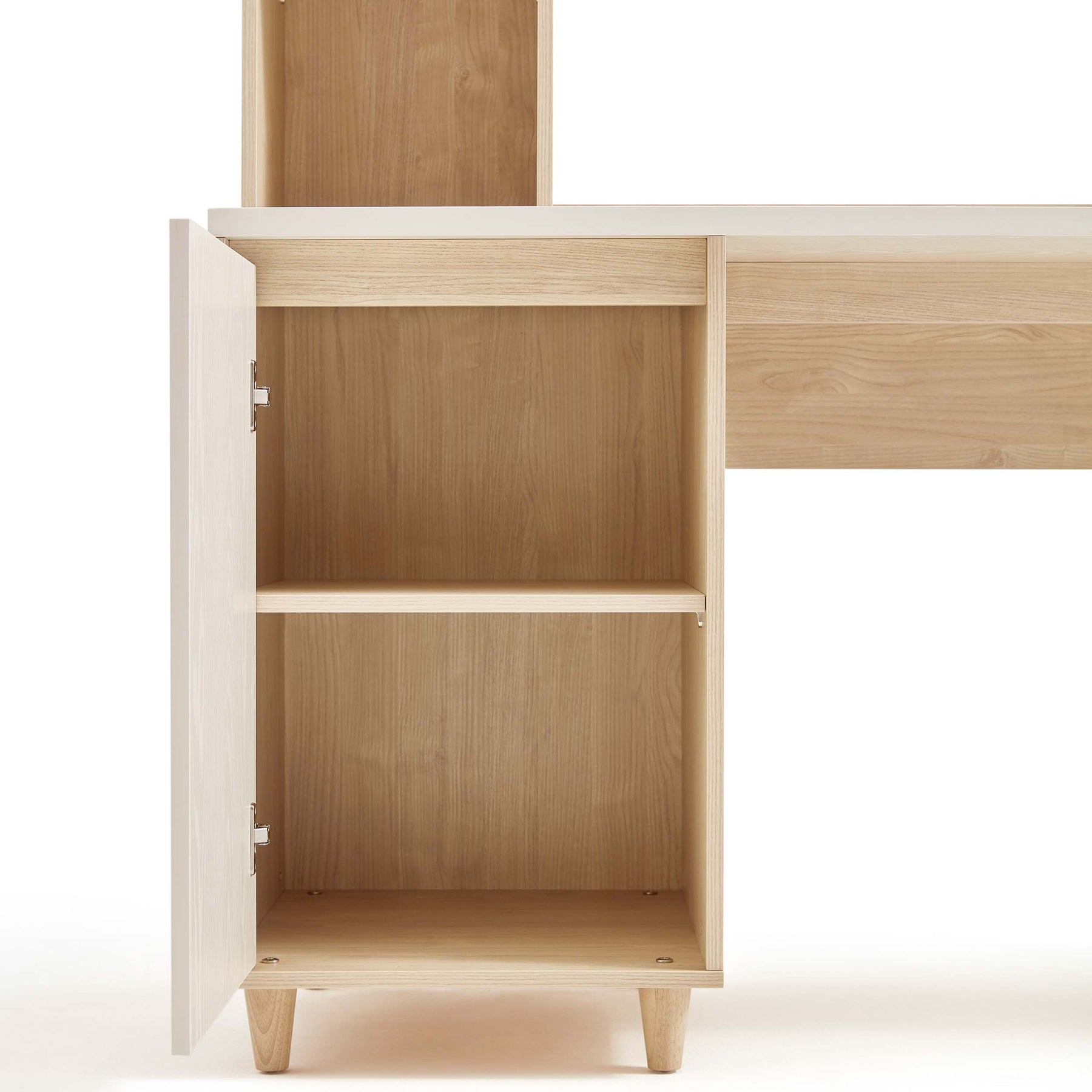 Built for study and small home offices, it features a discreet cable grommet, adjustable side shelves and multiple storage options including a lower cabinet with a removable inner shelf to organize books and decoratives while keeping a tidy workstation.