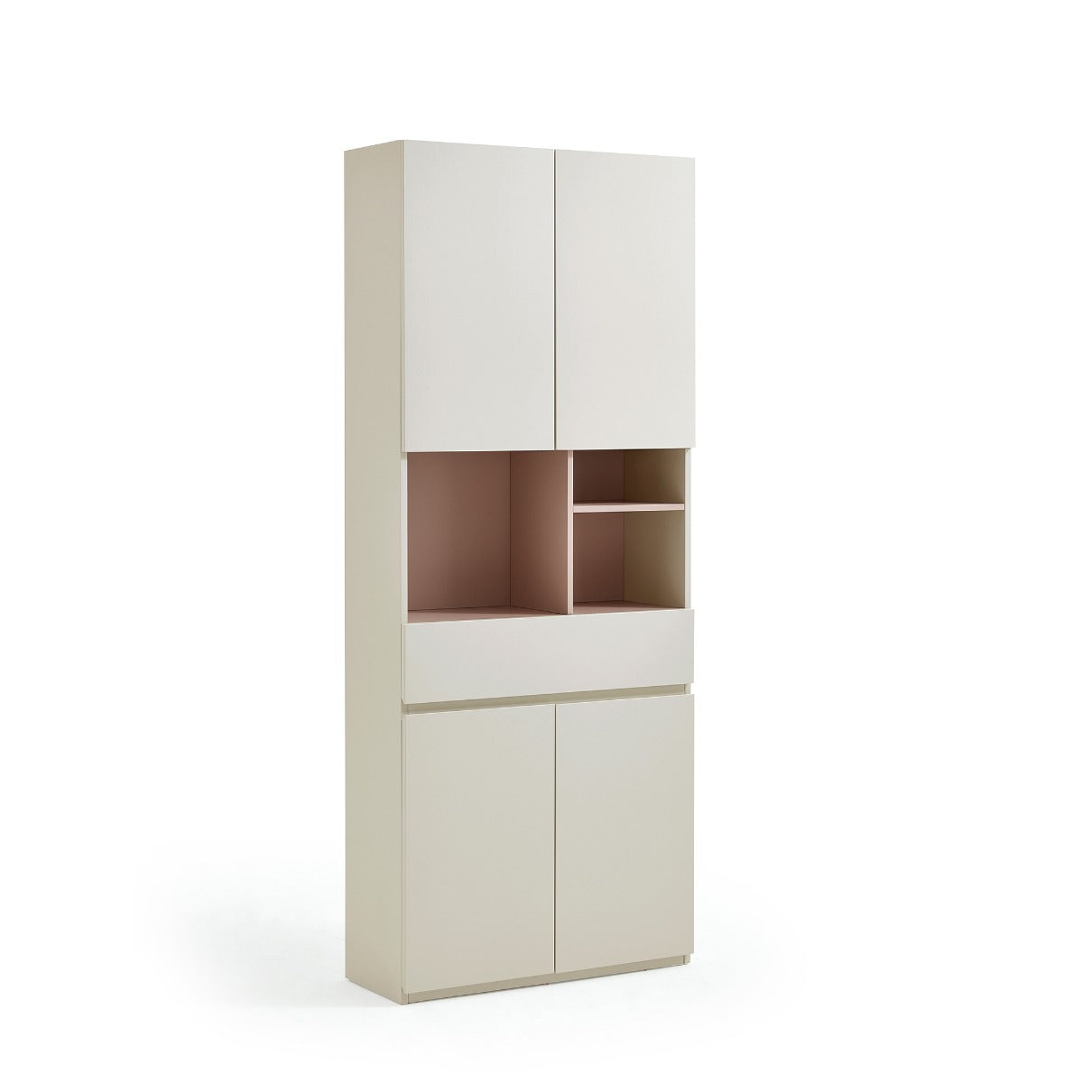 One drawer storage and multiple removable, three-level adjustable shelves create versatile organization for clothes, linens, and accessories with a slim vertical cabinet profile. Smooth melamine surfaces resist stains and offer a subtle modern texture with a refined minimalist silhouette suited to contemporary interiors.