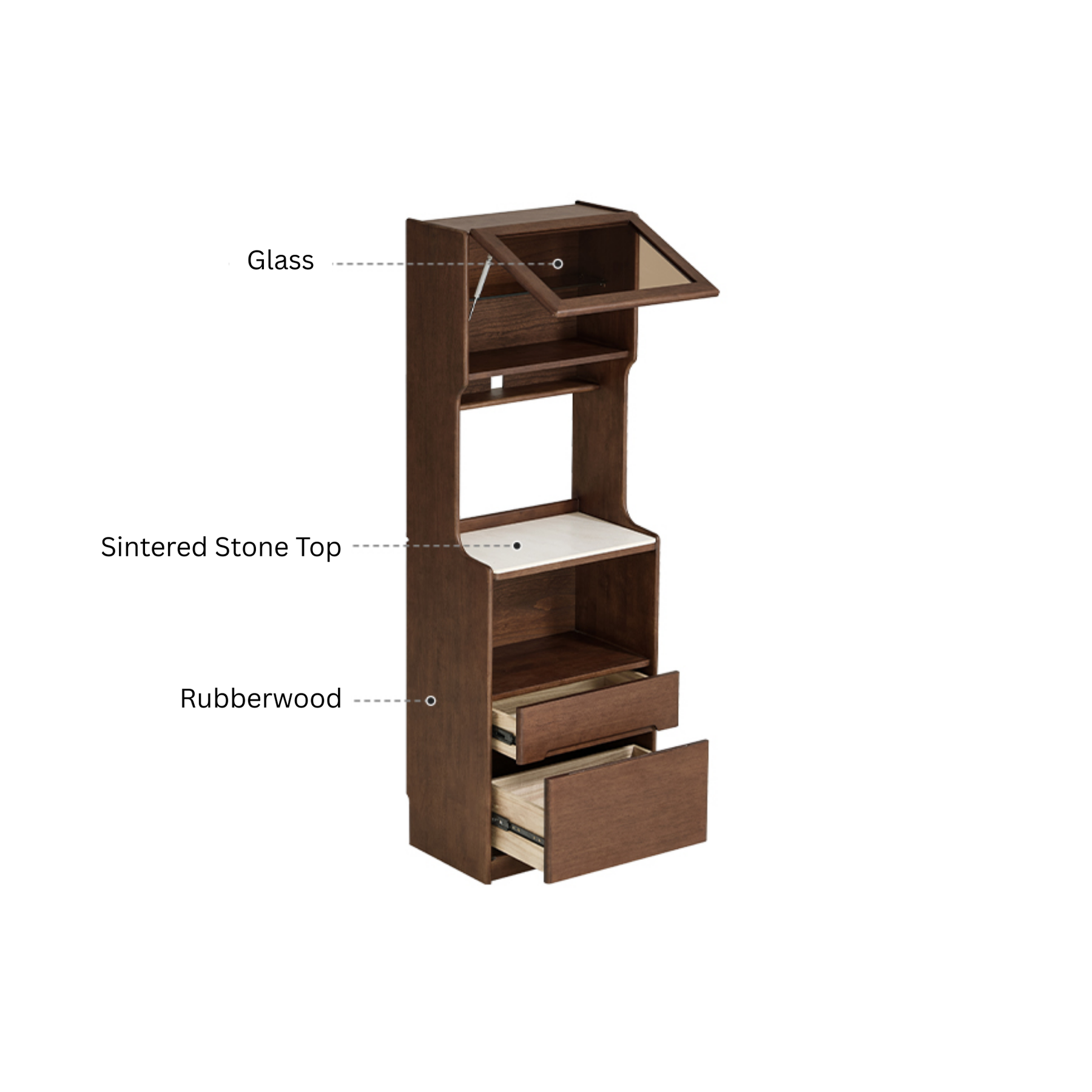 A multi-tier layout balances an upper cabinet, central open display nook and practical lower drawers with a sintered stone top, maximising storage in compact interiors while maintaining refined proportion and vintage-inspired charm for everyday living.