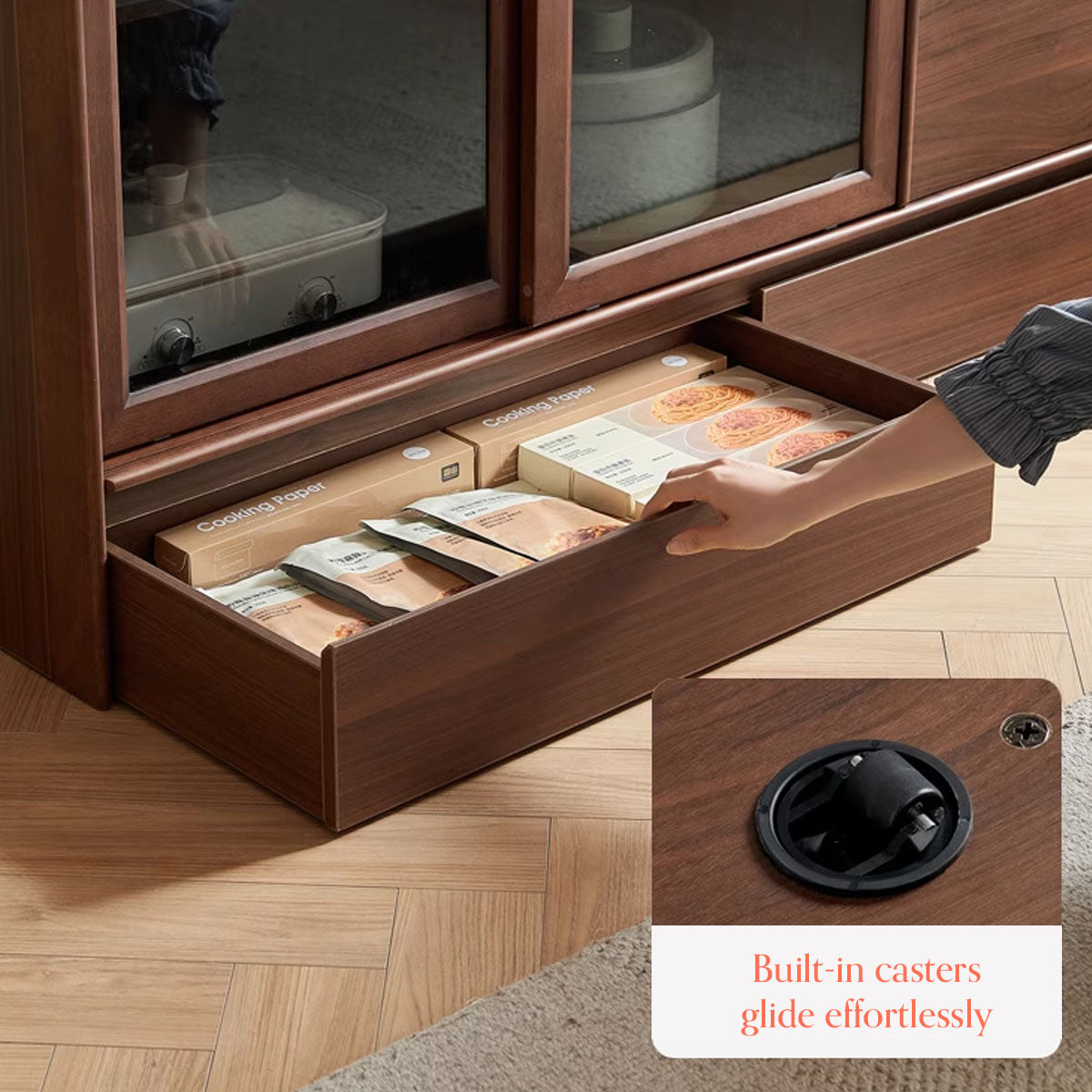Tempered‑glass sliding doors provide full‑view contemporary display; adjustable shelves, multiple drawers and a clever hidden toe‑kick drawer with built‑in rollers create configurable, smooth and efficient storage for living, dining or home office needs.