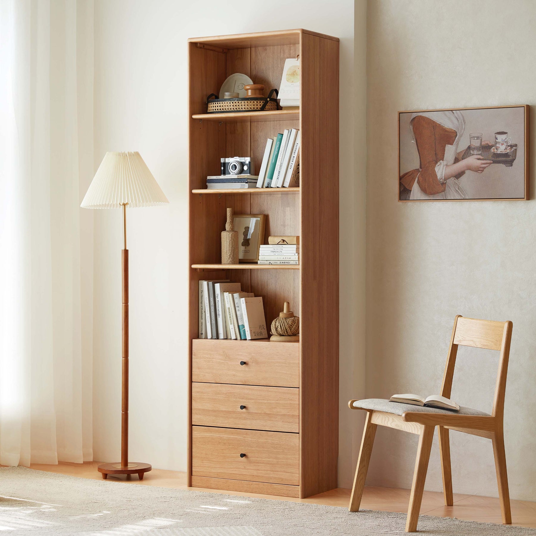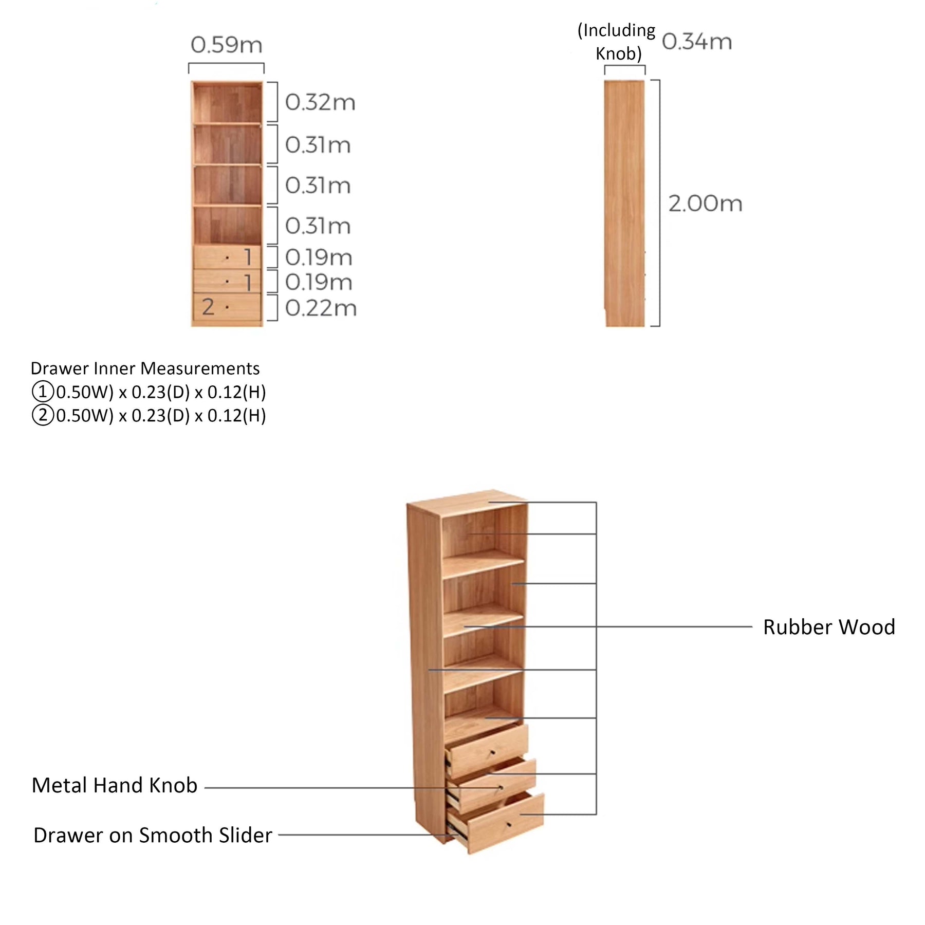 Crafted from kiln-dried rubber wood with a warm, natural grain and refined wood finish, this tall storage unit combines sturdy construction with elegant rustic-modern appeal. Three smooth-slider drawers provide organized concealment while fixed shelves present stable display space for books and décor.