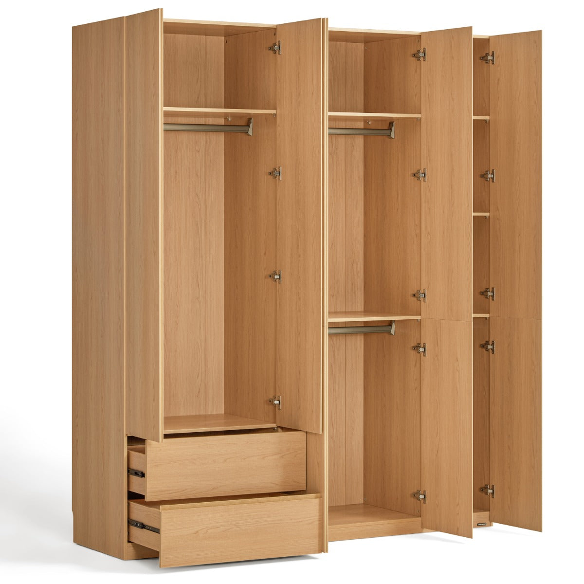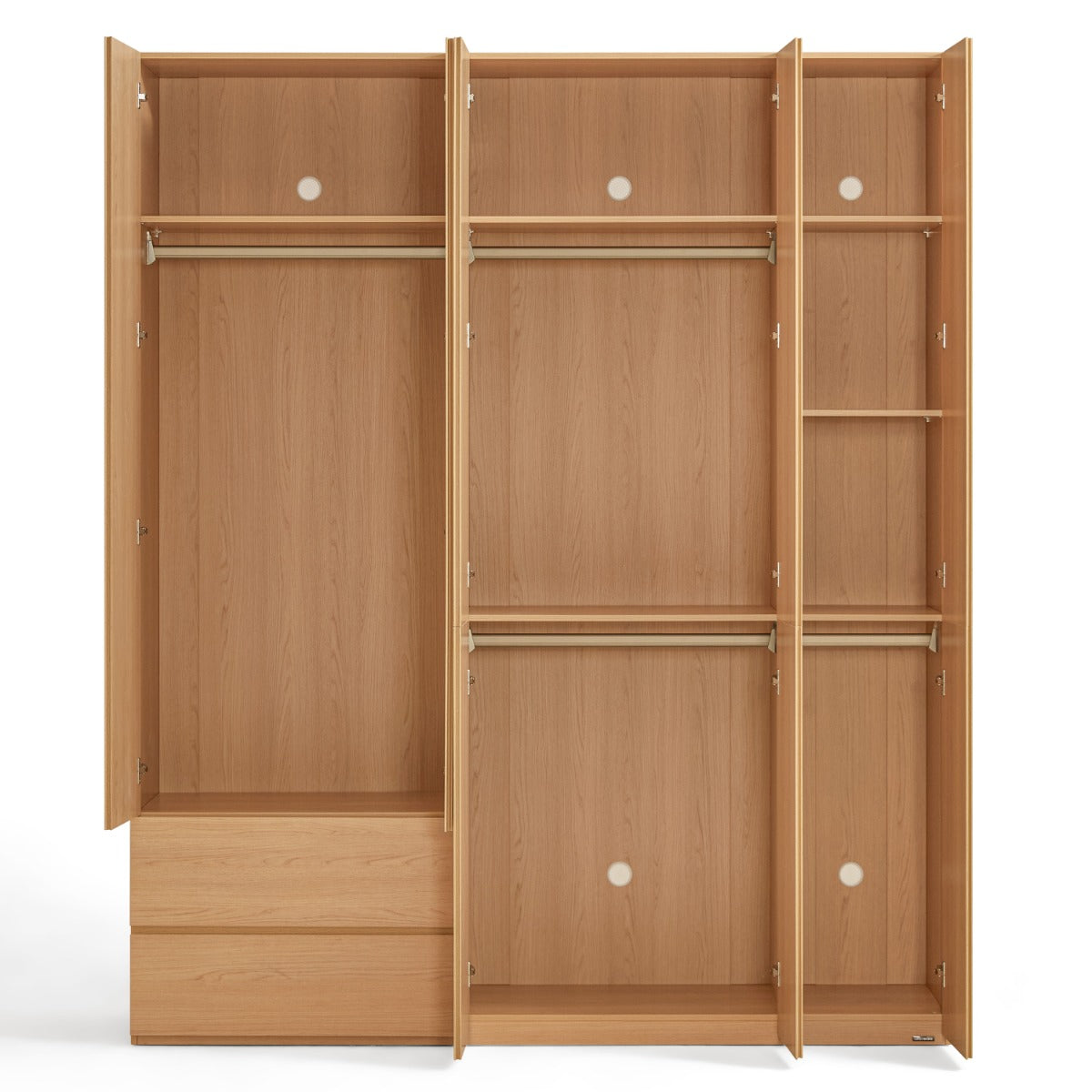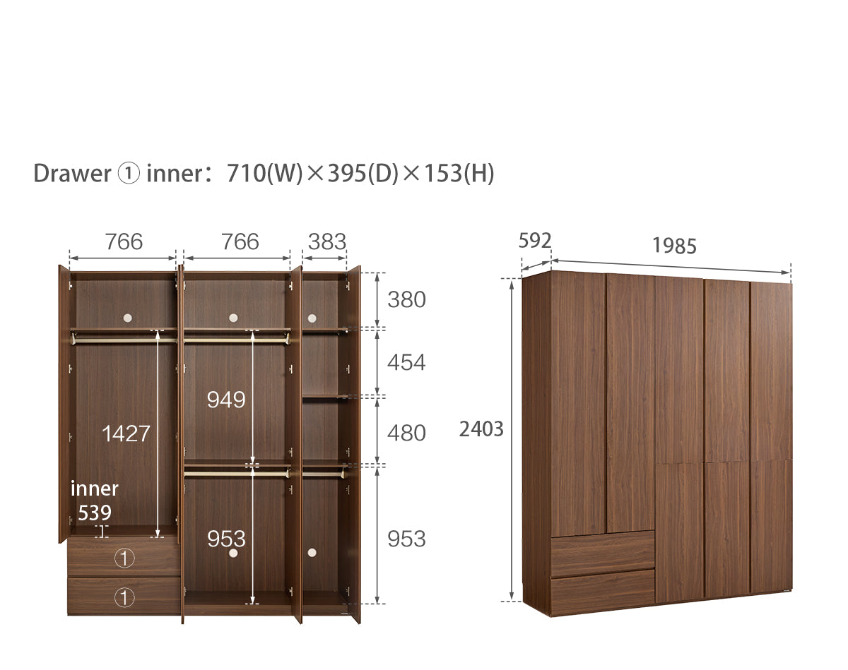 E0 Grade Melamine:Low-emission E0 melamine provides smooth, durable surfaces and healthier indoor air quality for long-lasting use. Soft-Close Mechanism:Soft-close doors and drawers deliver silent, gentle operation that protects clothing and reduces long-term wear. Organizational Segmentation:Multiple long- and short-hang zones with shelves and drawers enable precise storage for suits, linens, and accessories. Ventilated Back Panel:Integrated ventilation holes promote air circulation to keep garments fresh and minimise damp-related odors.