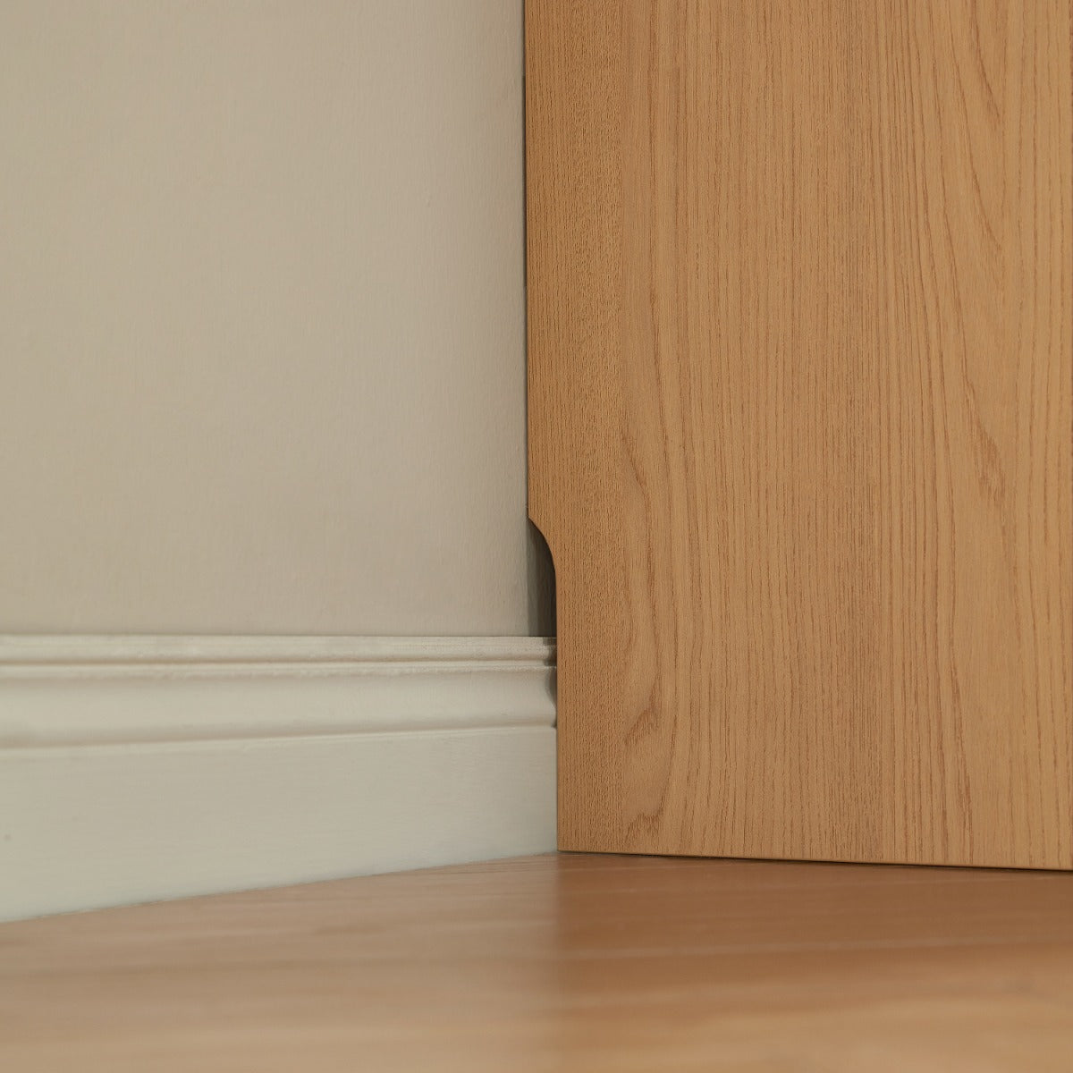 Extra-tall, full-height wardrobe with a seamless handleless facade in matte E0 melamine delivers a clean, contemporary look and an understated textured finish that resists scratches.