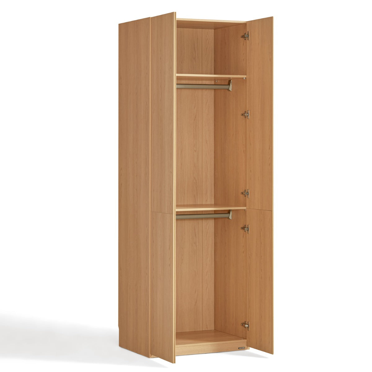 Floor-to-ceiling storage in a streamlined, handleless wardrobe finished in low-sheen E0 melamine creates a modern, minimalist aesthetic with smooth matte panels that resist stains and surface wear. Reinforced full-height doors maintain straight lines and lasting performance.