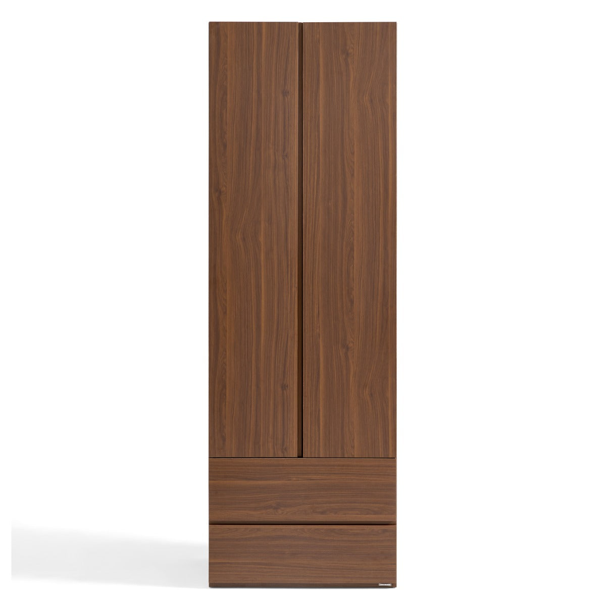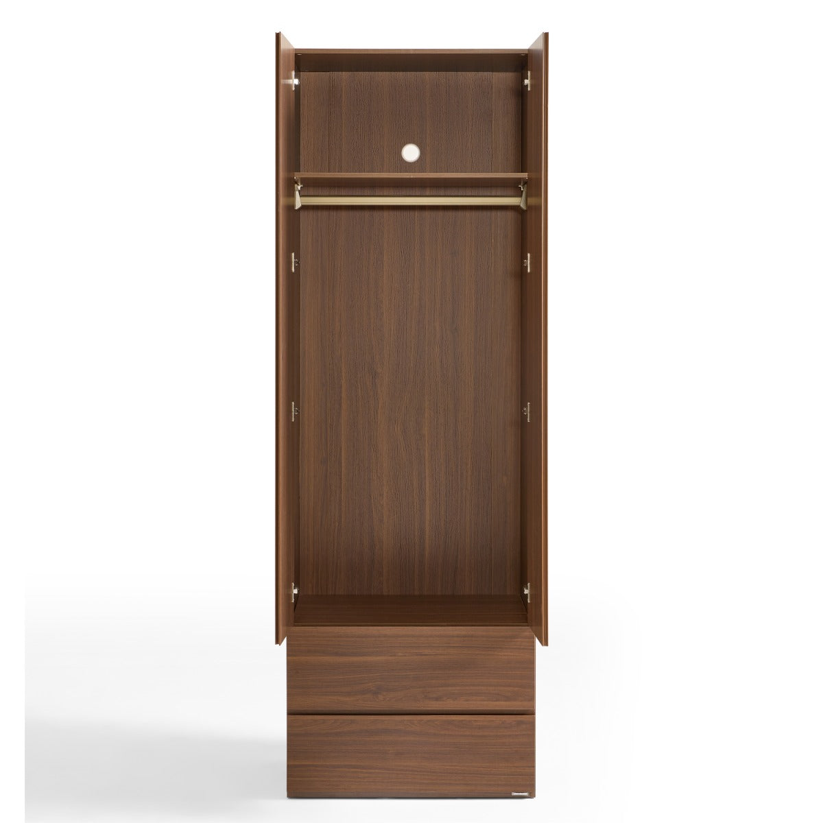 Interior layout combines a generous hanging rail and discreet soft-close drawers, plus a ventilated back panel to keep garments fresh; smooth aluminum hardware and quiet soft-closing mechanisms provide effortless, silent access.