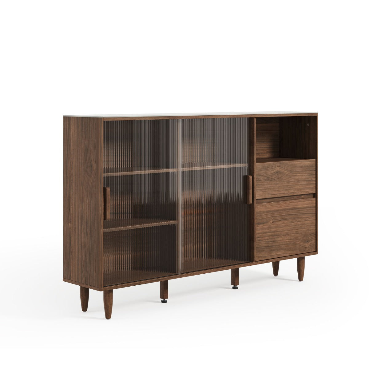 Two smooth-glide drawers, a glass-sliding closed compartment, adjustable ventilated shelves and an open shelf deliver dust-free, organized storage with clean lines and a slim profile suited to modern living spaces.