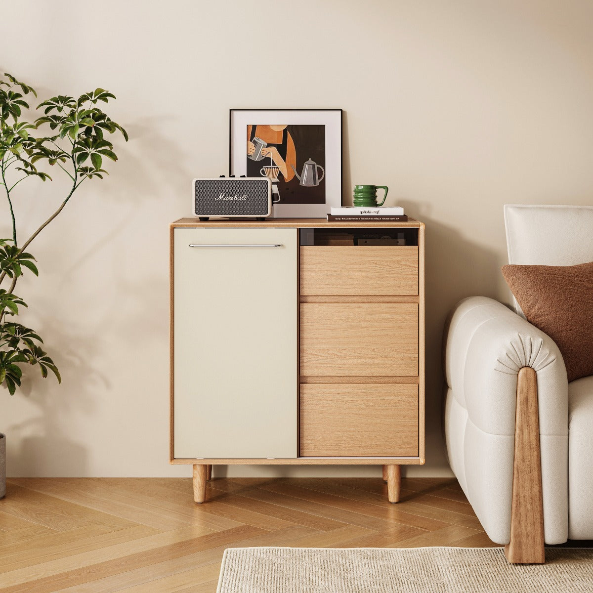 Flexible storage with three adjustable shelves and three spacious drawers offers tailored organization, blending open display and concealed storage. A contrasting cream sliding door provides space-saving customization while a minimalist metal handle and transparent glass drawer add refined modern detail.