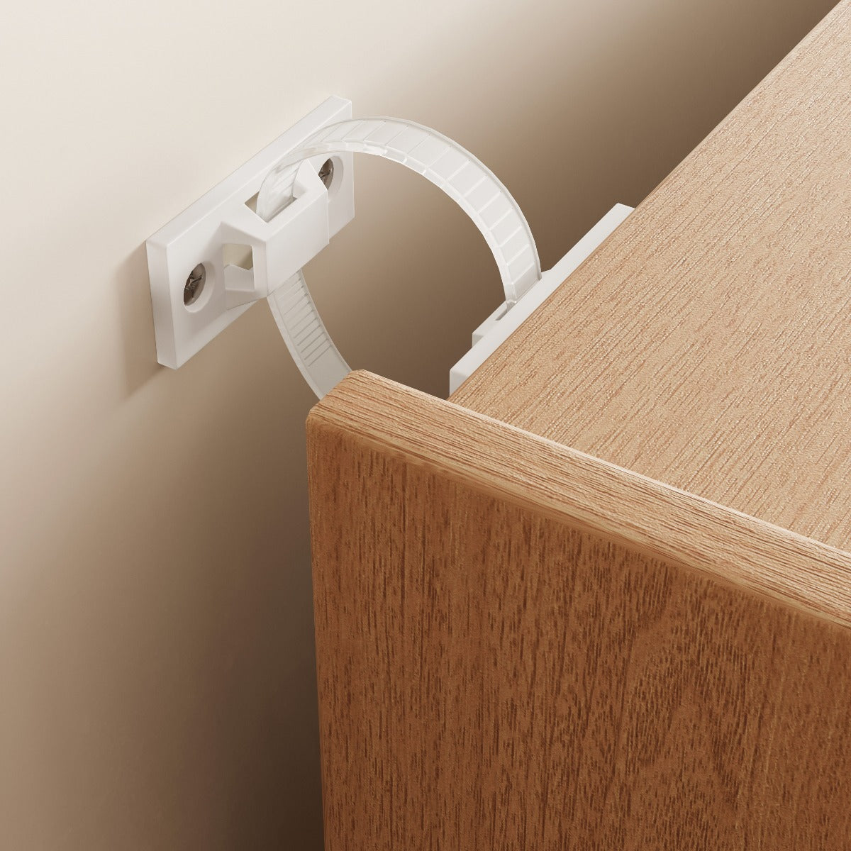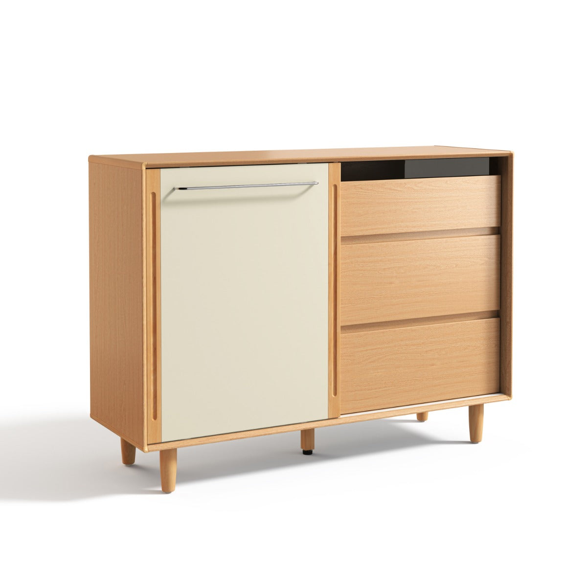 Contrasting cream sliding door against a warm, soft-matte textured melamine surface creates a refined two-tone aesthetic, complemented by a sleek minimalist metal handle and transparent glass panel on the top drawer for a subtle contemporary accent.