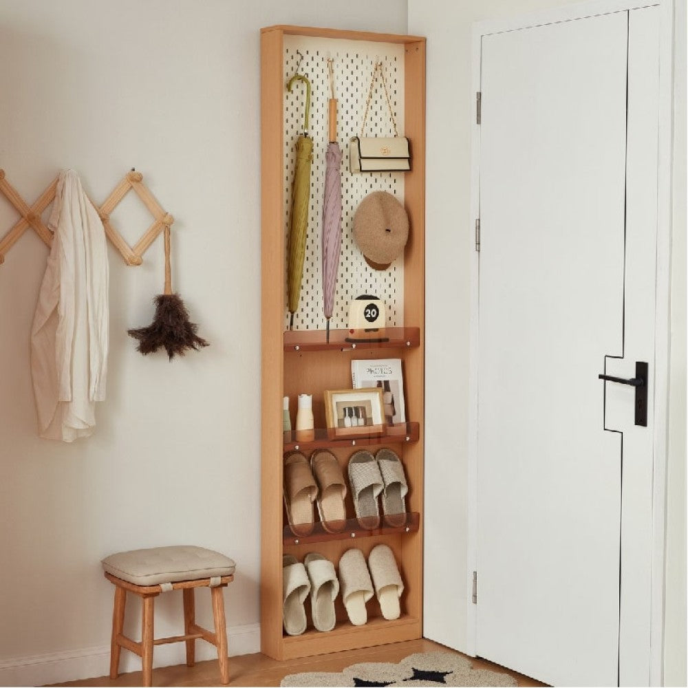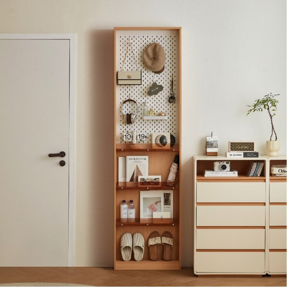 Slim vertical cabinet design features a built-in pegboard back panel for flexible, wall-friendly organization. Natural wood finish delivers a clean, minimalist look while maximizing storage within an ultra-thin 12.9cm depth.