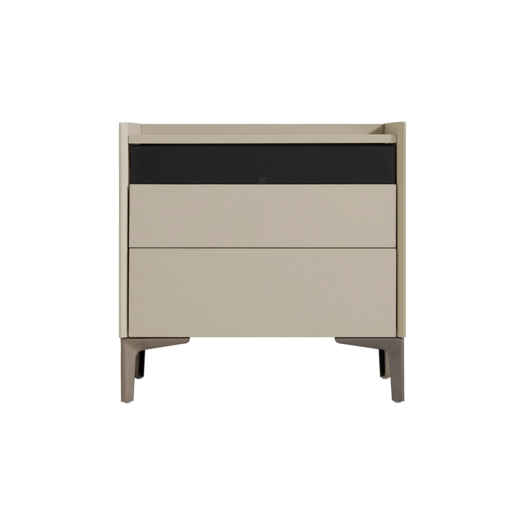 Sleek glass drawer panels and slender metal legs give the nightstand a minimalist, contemporary silhouette with a smooth melamine finish, durable Triamine board core, and subtle texture that complements modern bedrooms.