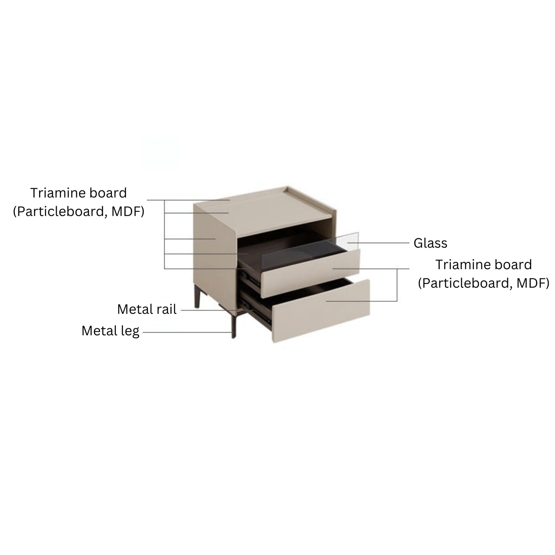 Triamine board (Particleboard, MDF), Metal, Glass, Melamine