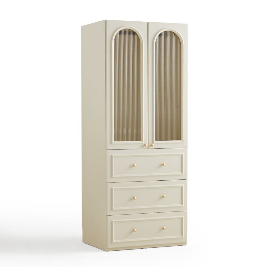 Elegant arched fluted glass doors with an arched top offer a refined, semi-transparent view of garments, finished in soft cream with brass knobs for classic bedroom charm; E1-grade melamine panels deliver a smooth, durable, low-sheen texture.