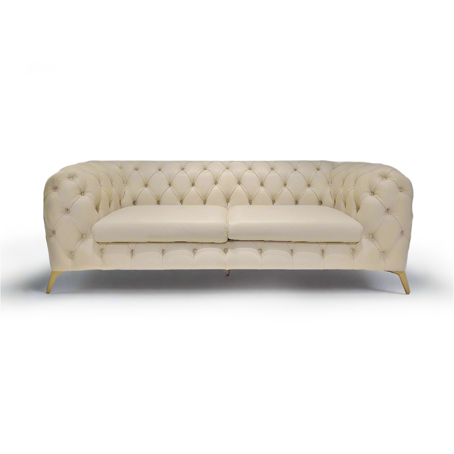 Elevate your living space with this exquisitely crafted sofa that encapsulates comfort, style, and modern luxury. Wrapped in the finest leather and generously filled with premium down materials, this tufted masterpiece is a visual delight. Radiating Italian flair with its sleek design and rounded edges, it effortlessly merges sophistication with comfort. Immerse yourself in the essence of Italian artistry and quality with this beautifully handcrafted sofa.