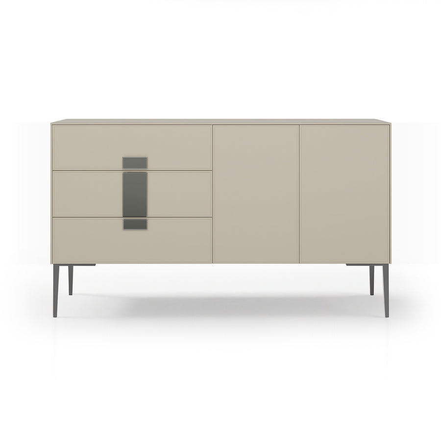 The unit includes three spacious drawers for convenient organization and two cabinet doors, perfect for discreetly stowing larger items. Supported by sleek dark metal legs, this piece combines functionality with contemporary style, ideal for modern living spaces.