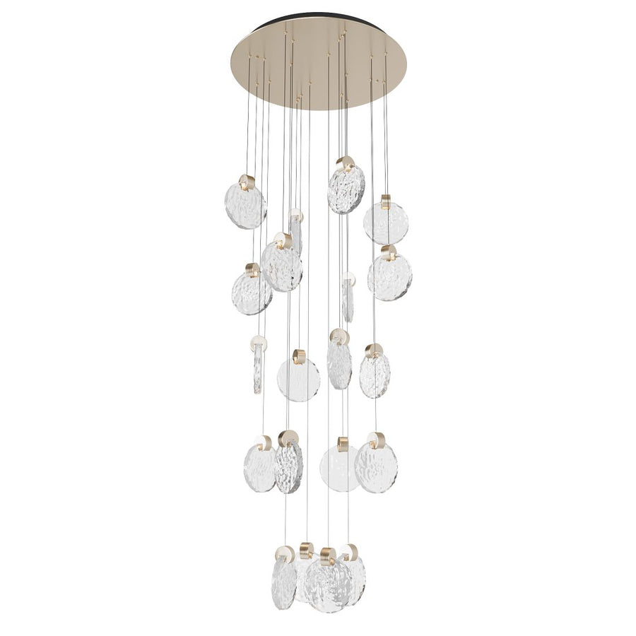 Transform your space with the Gold Crystal & Aluminum Pendant Lamp, a modern masterpiece featuring adjustable height and dazzling clear crystal shades. Available with 6 or 20 lights, this fixture combines a sleek polished gold finish with bubble-textured crystal glass, creating a captivating ambiance in staircases, foyers, and dining areas. Each light is powered by an enclosed LED module for energy efficiency and a clean, screw-free look.