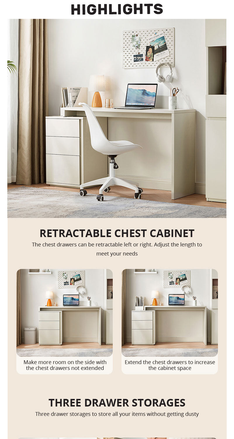 A seamless blend of minimalism and utility, our study desk epitomizes modern functionality. It features a trio of drawers for organized storage and an innovative extendable desktop that provides additional workspace to suit various study or work needs. The clean lines and neutral palette ensure it complements any contemporary interior.