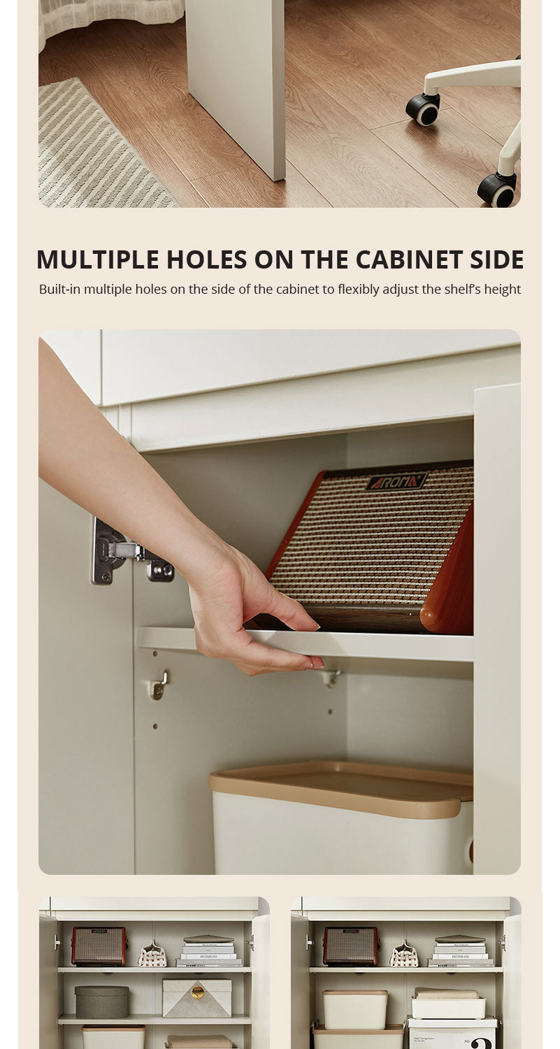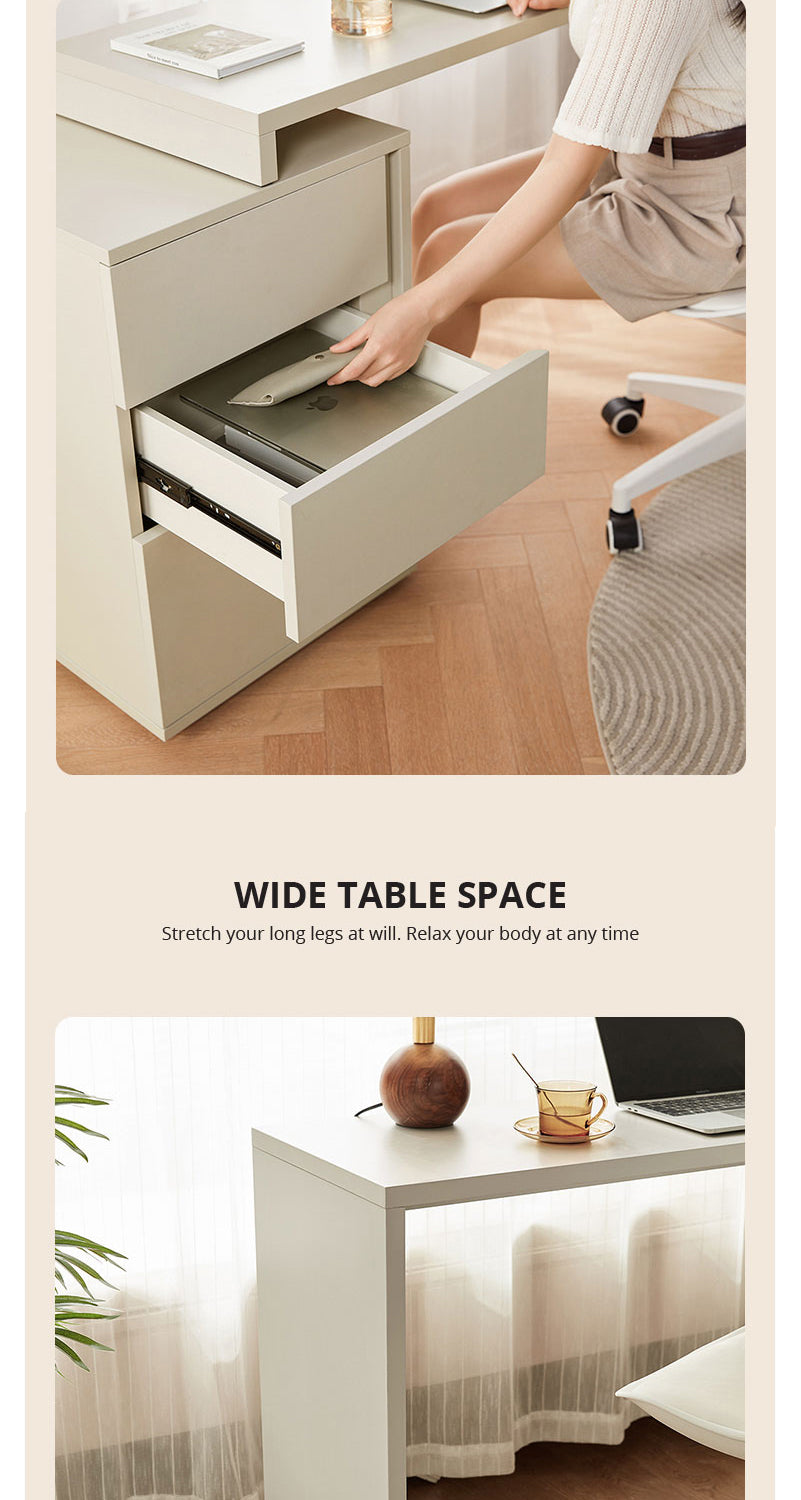 The desk's design is grounded with a fixed lower cabinet placement as shown, offering a stable and permanent solution for your work essentials. It's a statement piece that not only enhances productivity but also aligns with a sophisticated design ethos.